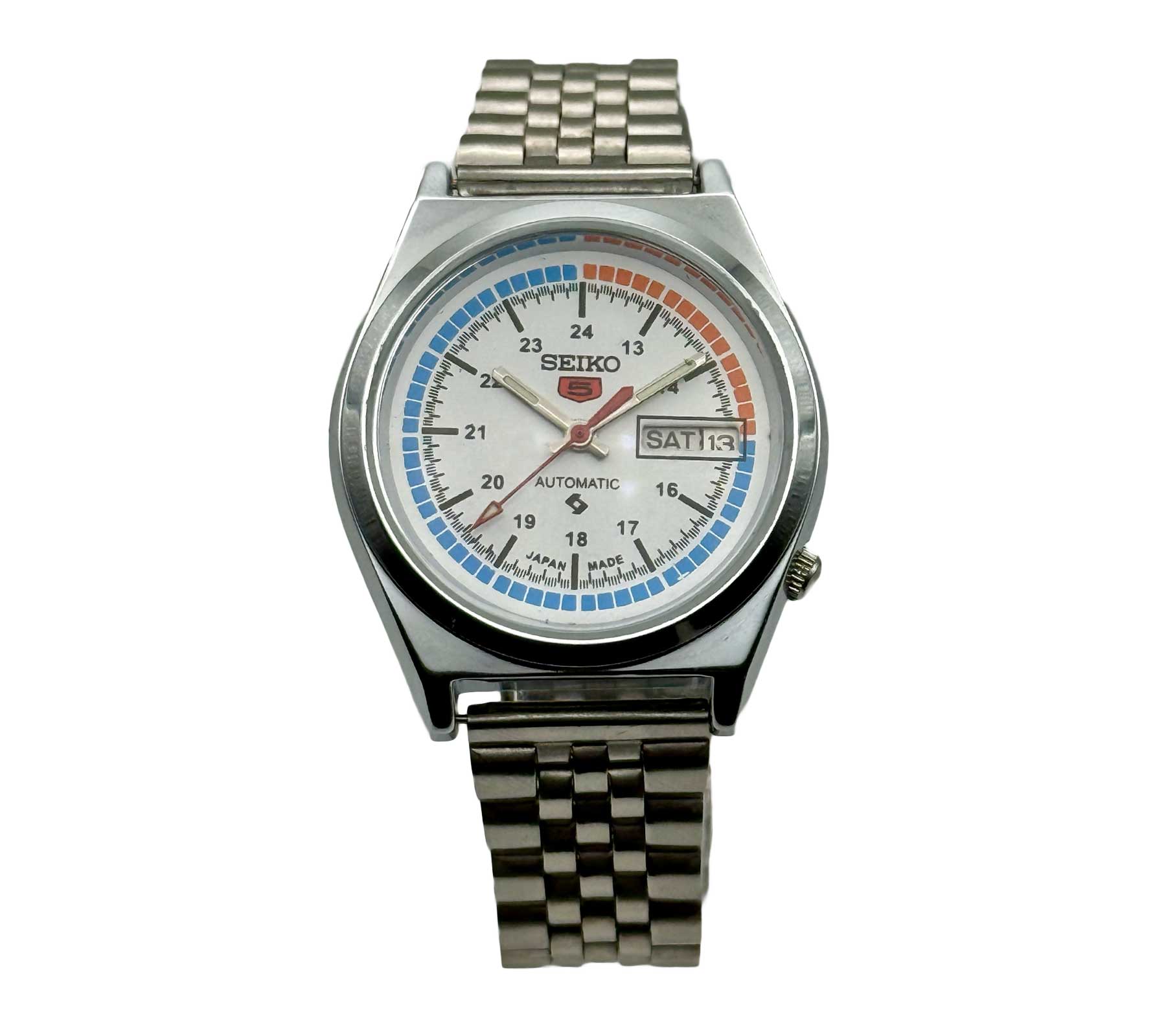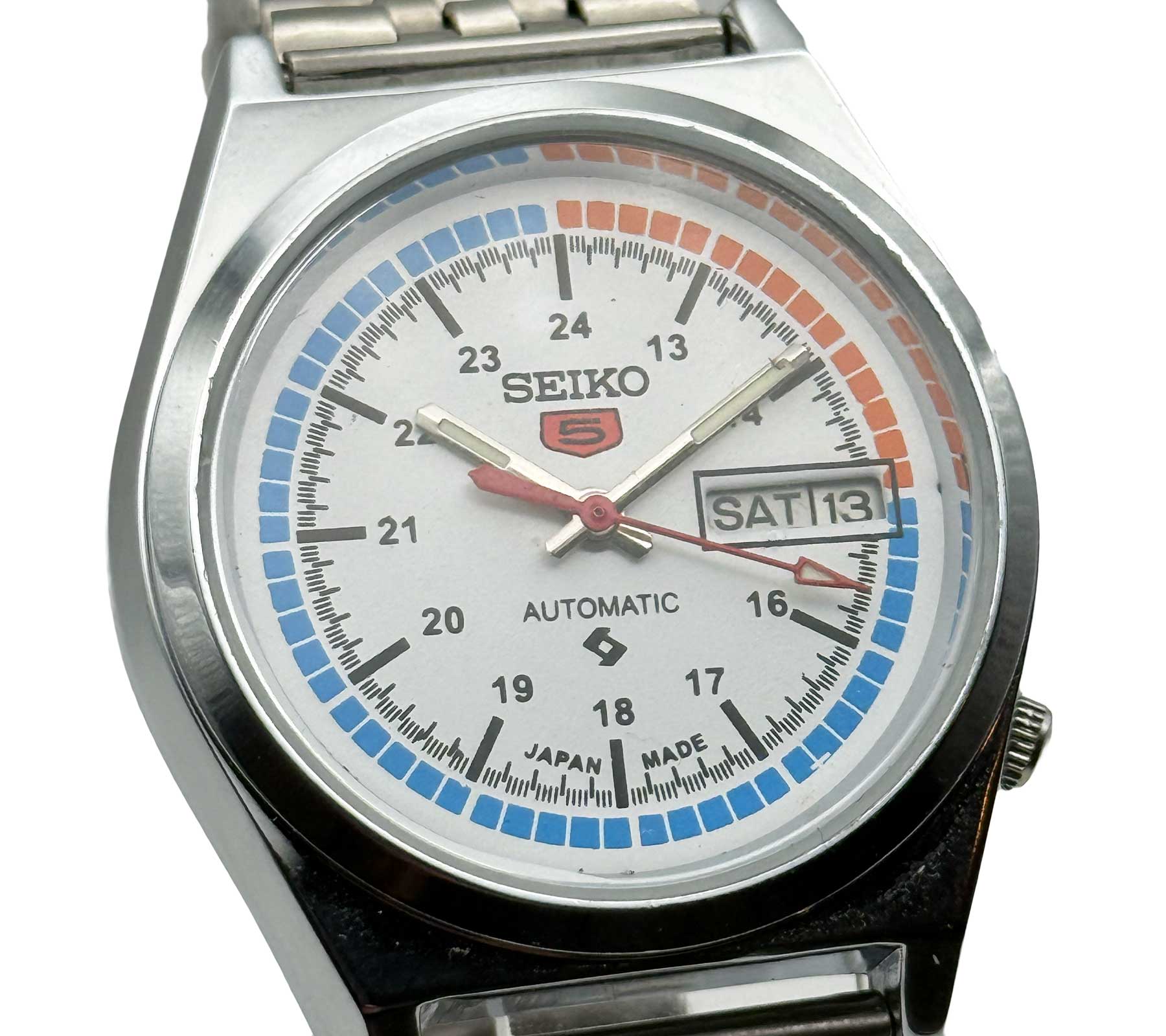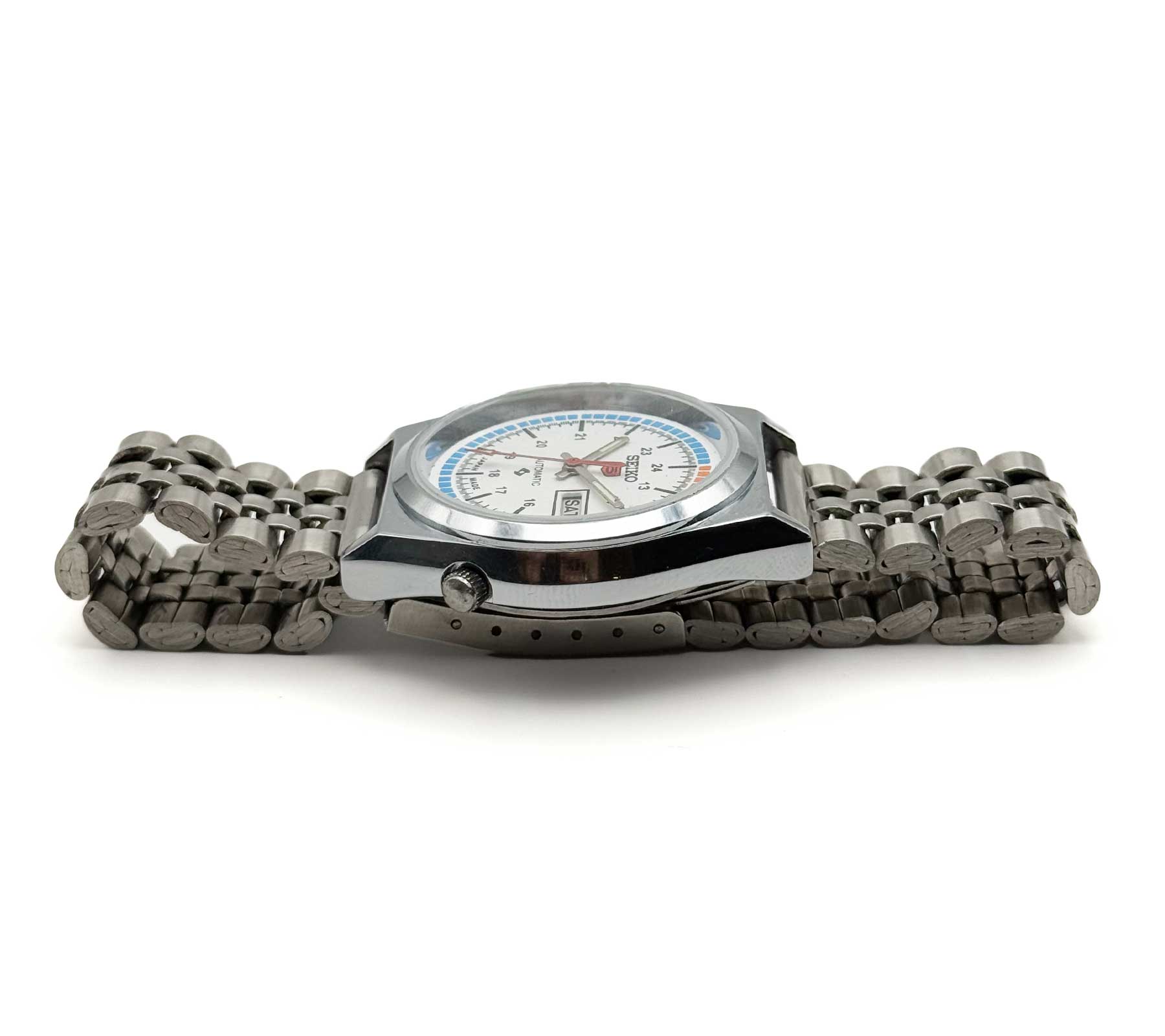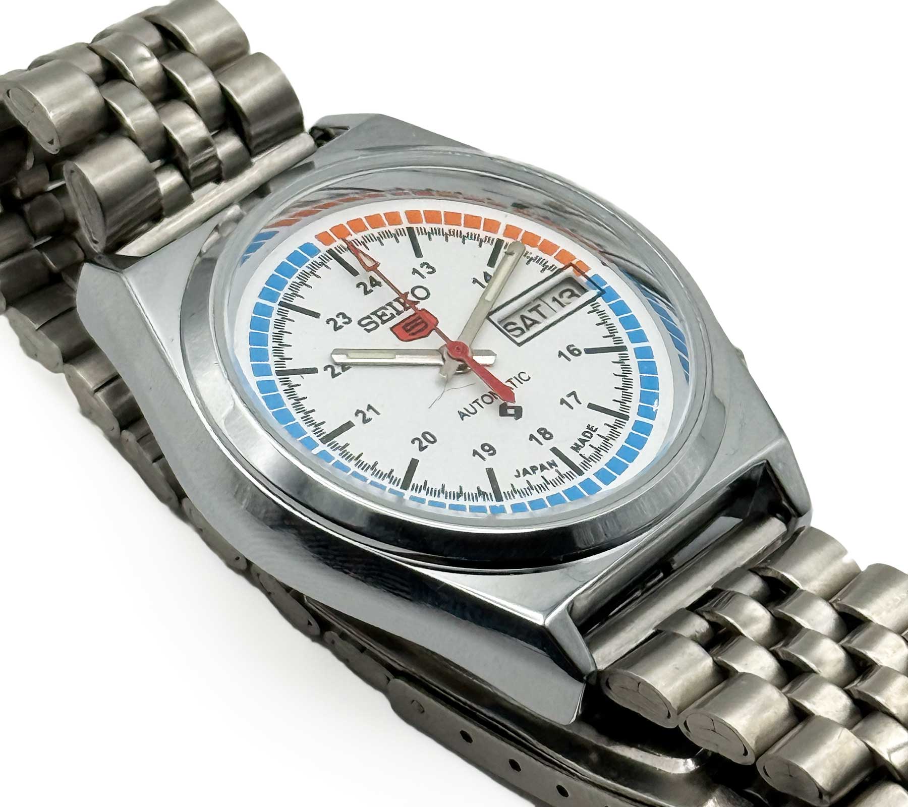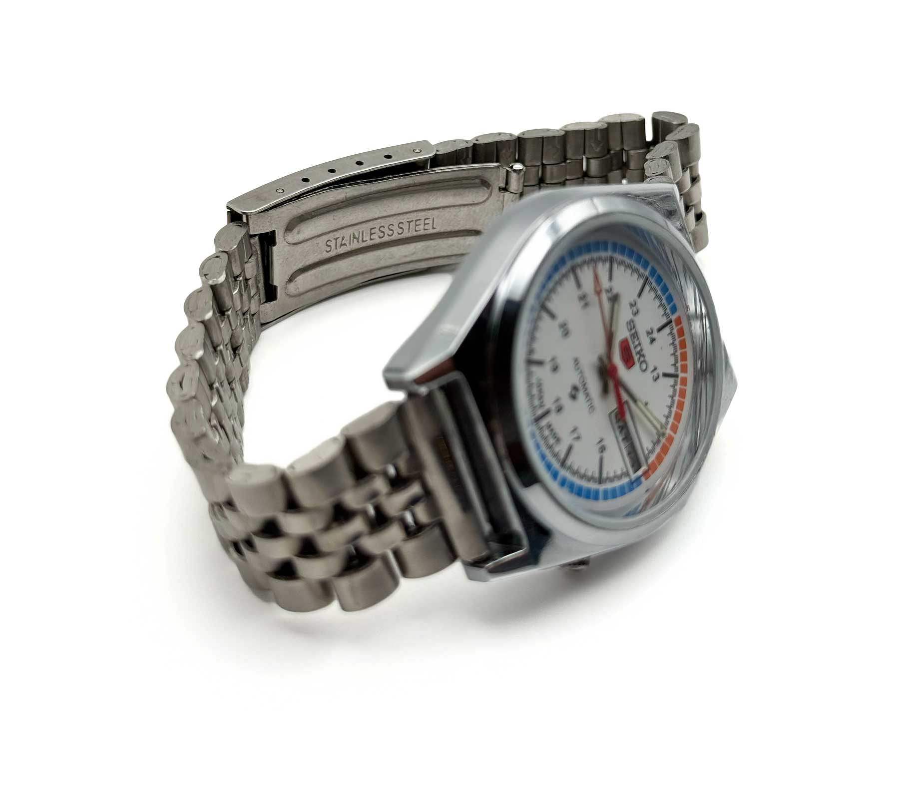 Description: Beautiful white Dial with “Pepsi” border, Day/date display 3 o’clock, 3 hands (hours, minutes, seconds). Serial number dates to a 1983 production. Note, this Seiko features a genuine vintage Seiko movement (6309a) that has been serviced and is is good working order. Some original parts have been replaced with genuine Seiko parts, case, acrylic and dial are aftermarket.