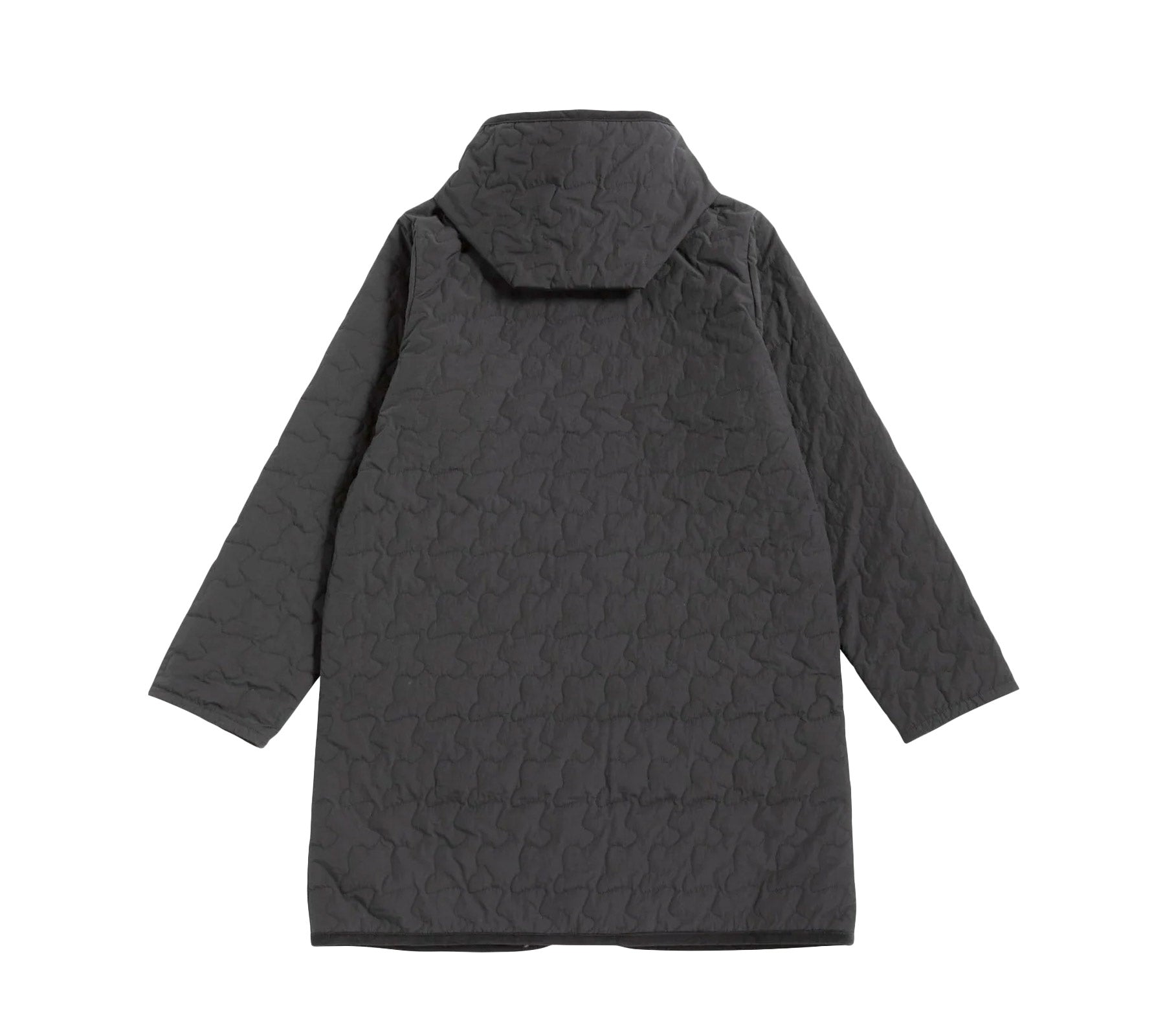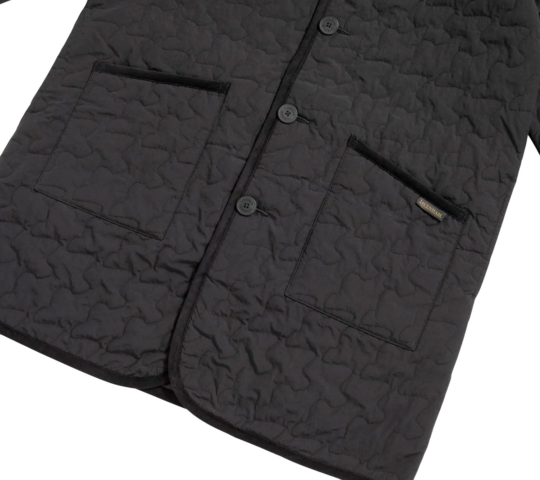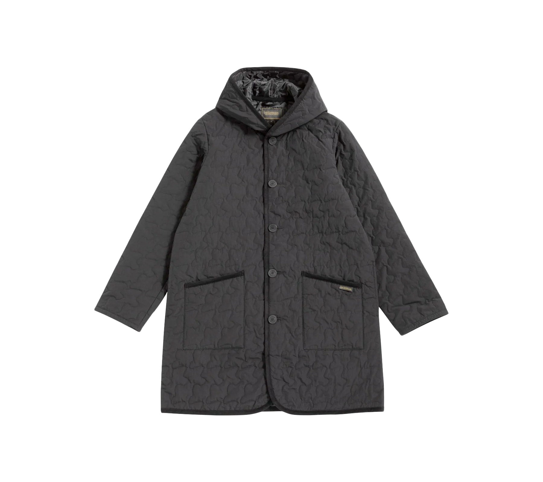 Made from a crispy water-resistant nylon that has been quilted in a unique cloud pattern, this jacket features a structured hood and regular fit through the body. Wadded lightly with a partially recycled polyester wadding making the jacket ideal for between the seasons wear. Finished with two patch pockets, cotton corduroy binding and a press stud fastening.