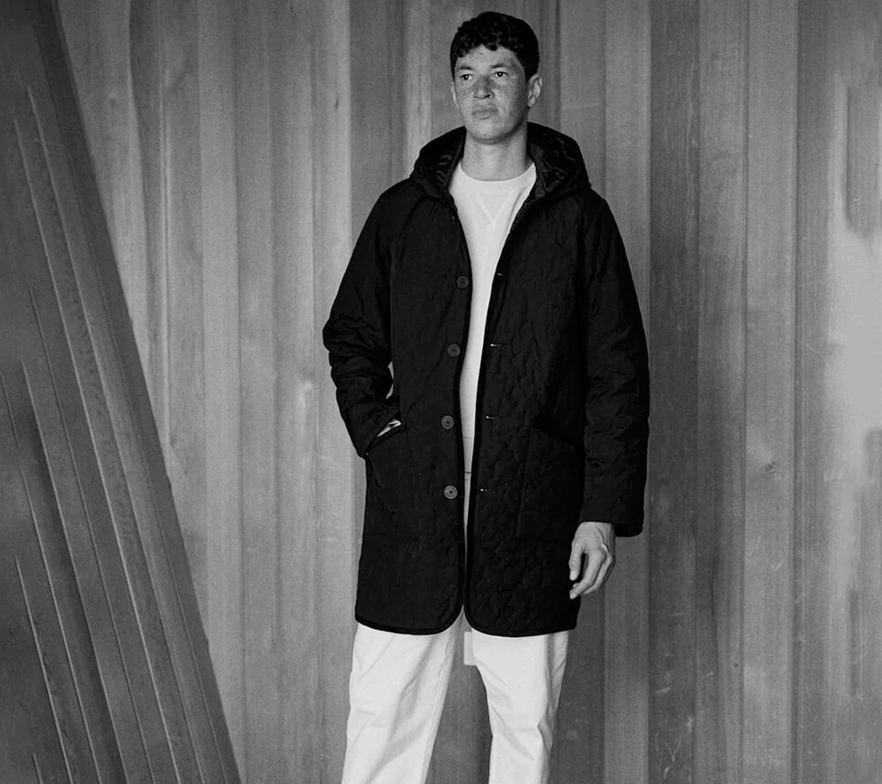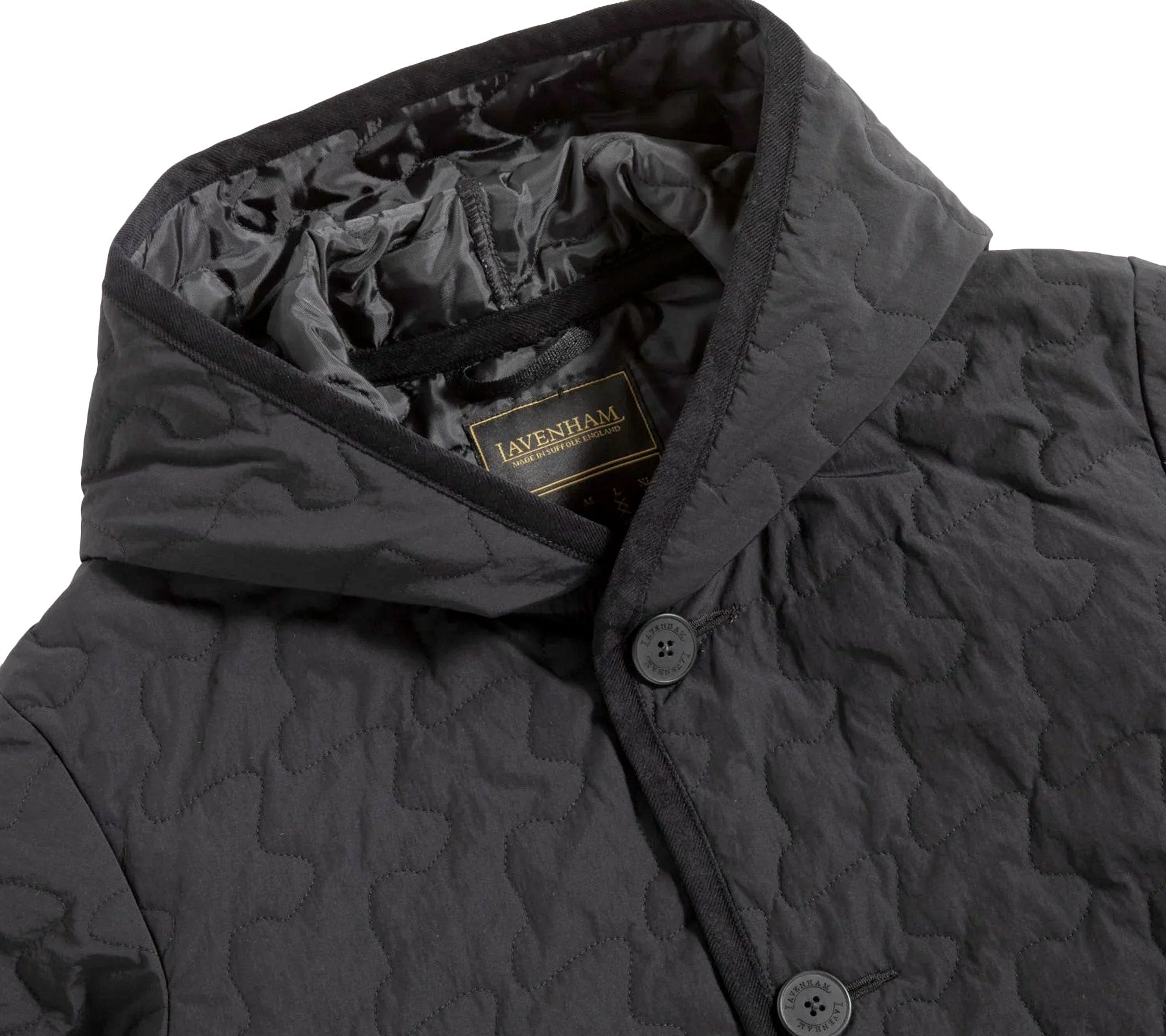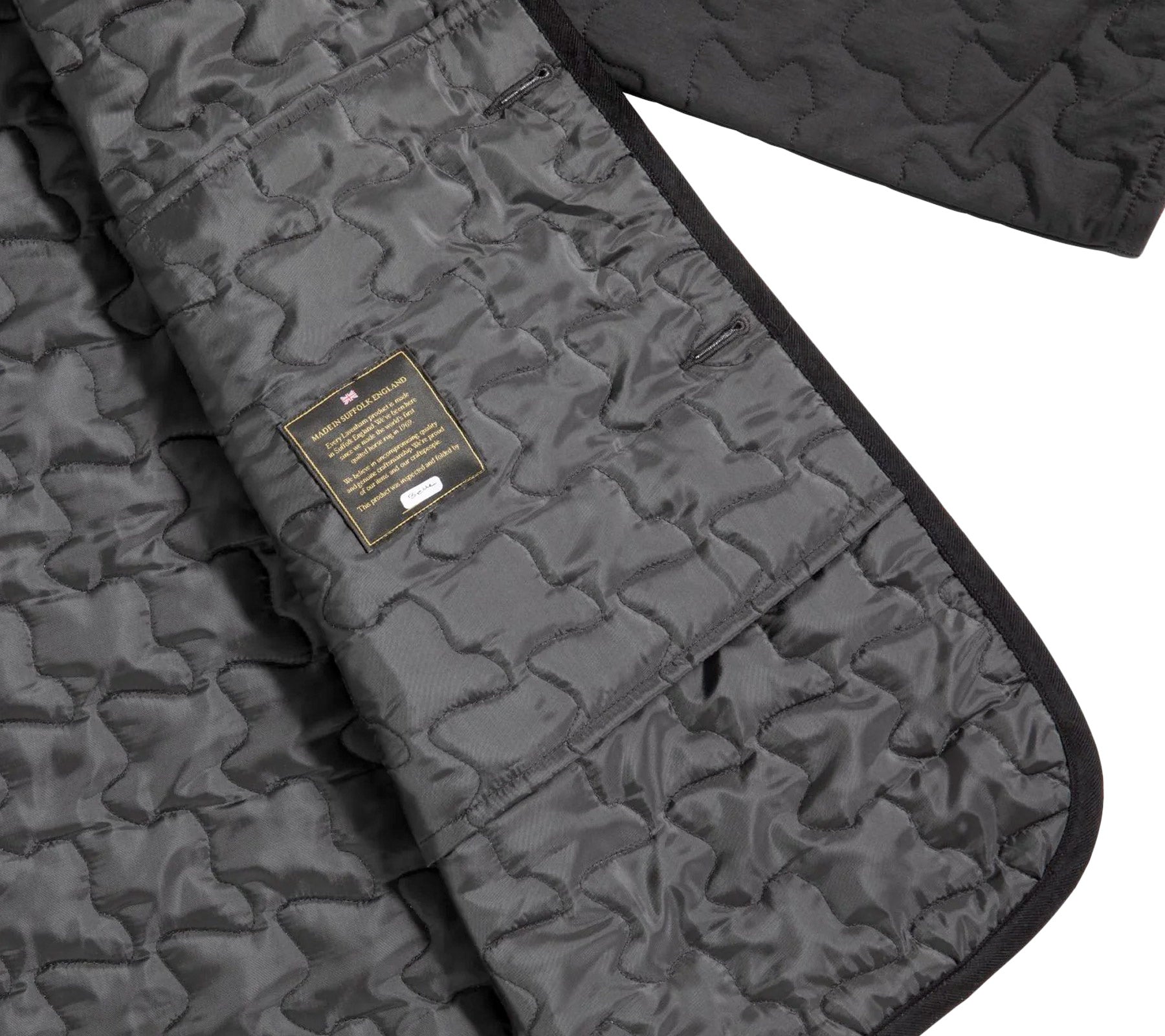 Made from a crispy water-resistant nylon that has been quilted in a unique cloud pattern, this jacket features a structured hood and regular fit through the body. Wadded lightly with a partially recycled polyester wadding making the jacket ideal for between the seasons wear. Finished with two patch pockets, cotton corduroy binding and a press stud fastening.