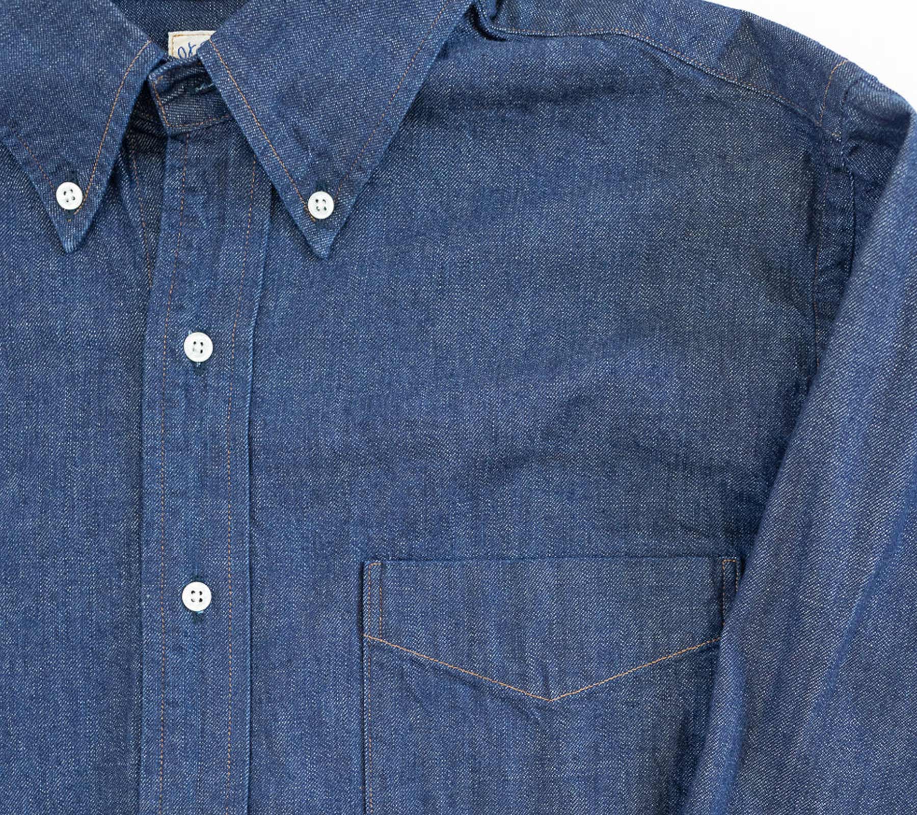 The Button Down Denim Shirt One Wash by orSlow is crafted from single rinsed Japanese denim, offering durability with a refined finish. Designed with a classic American workwear silhouette, it features a button-down regular collar, a practical single chest pocket, and double-stitched seams for enhanced strength. The curved hem adds a subtle contemporary touch, while its 100% cotton construction ensures comfort and breathability. Made loose and comfortably casual.