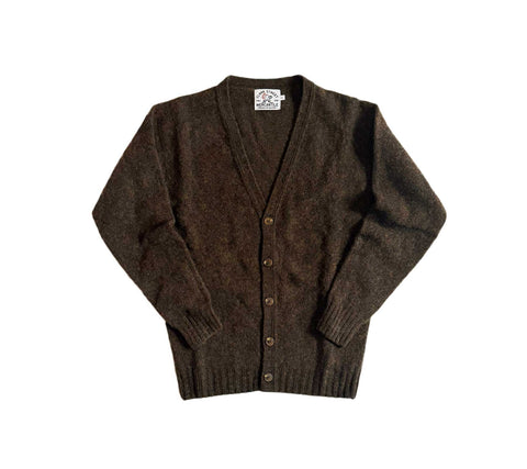 A soft Brushed 100% Scottish Lambswool knit cardigan sweater. Made by traditional knitwear experts in Northern Scotland, using locally sourced and spun Shetland and superfine Lambswool. Featuring a V neck, in a medium weight, it is entirely seamless -meaning it is knitted tubular and cast off the machines as a complete sweater, leading to little to no waste in production.