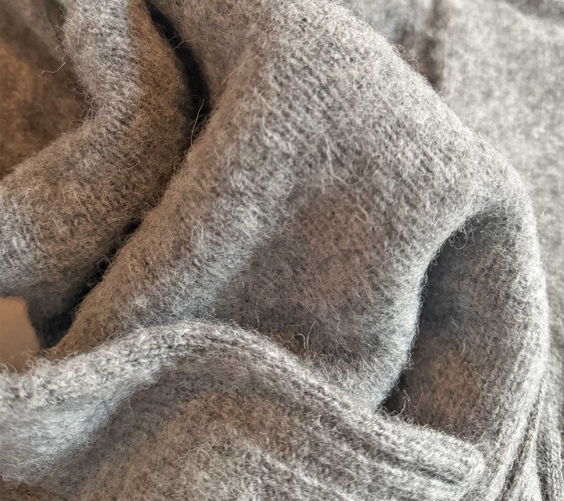 The brushed knit uses an artisanal (and entirely natural) teasel brushing technique which lifts and pulls the fibers for a loose and relaxed shaggy brush effect. It is as soft as it looks.