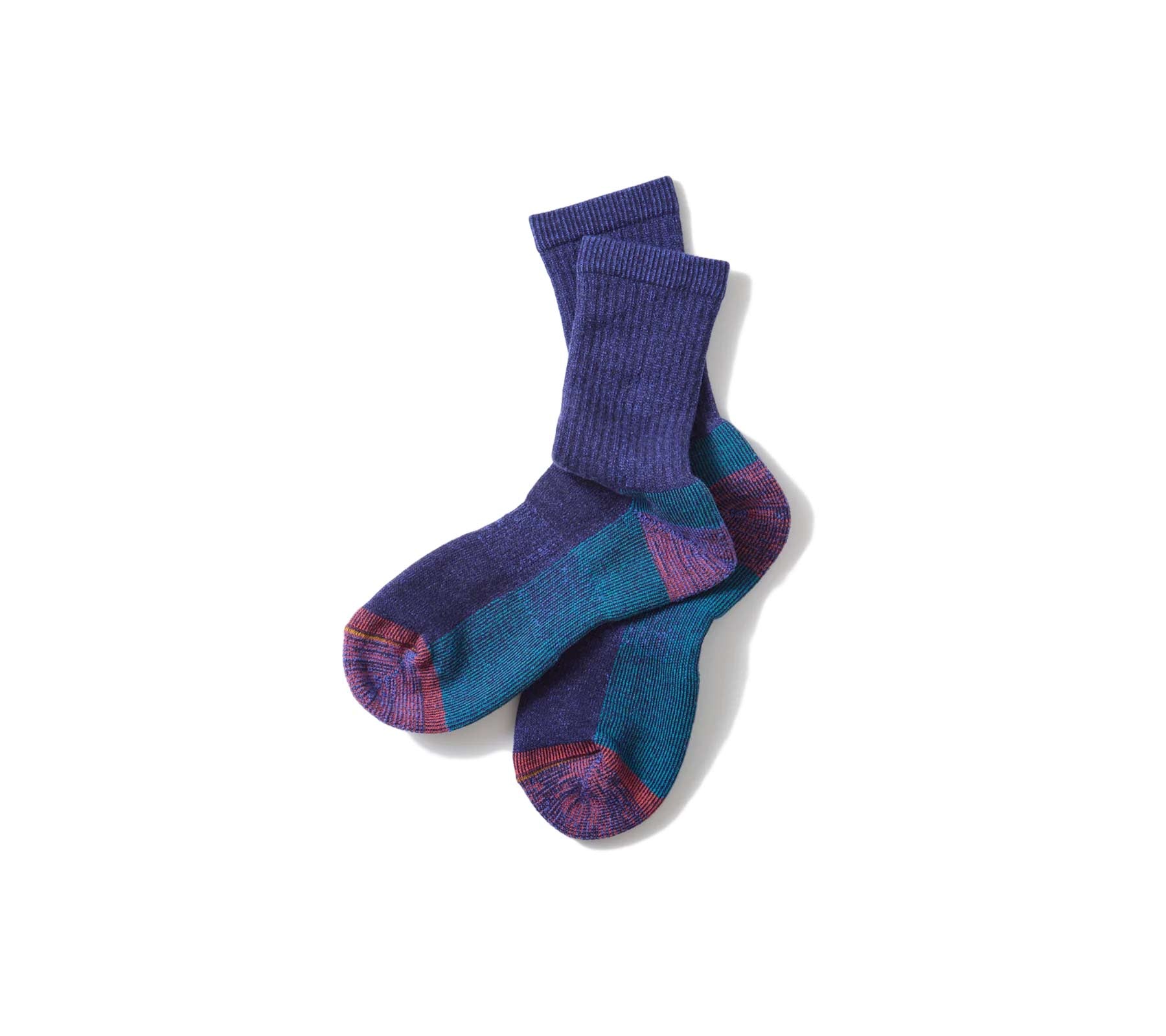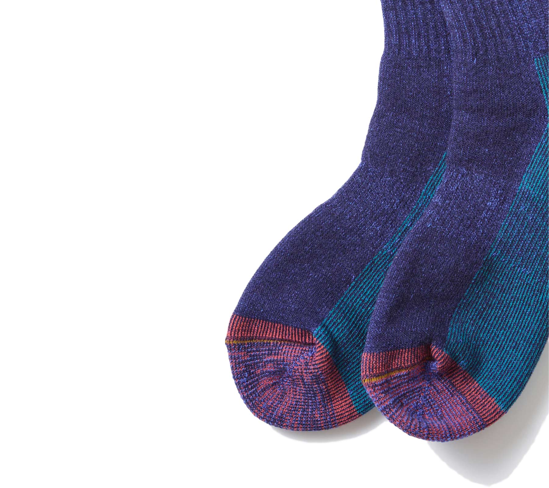 These merino wool pile socks are inspired by outdoor and trekking socks, reimagined with a fit suited for daily wear. To overcome wool’s natural weakness against friction, a special technique is used to knit the surface with a cotton covering, enhancing durability. The color-blocked areas at the toe, heel, and sole are reinforced with nylon yarn for added strength. Ref. 1632