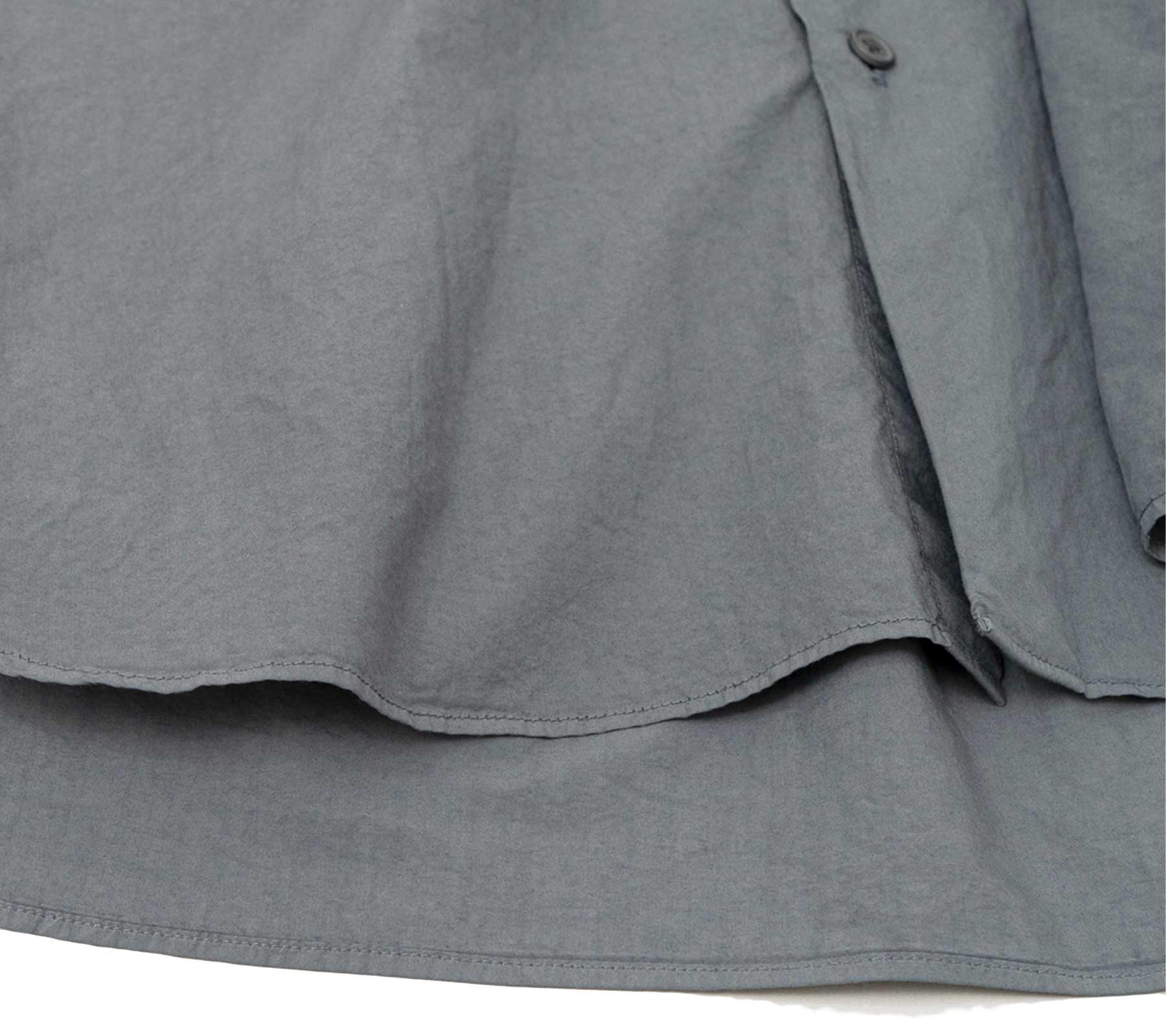 Crafted from 100% cotton peach skin fabric produced in Hamamatsu, Shizuoka, this shirt offers a unique texture with a slightly creasy, dry, and crispy surface. The fabric strikes a balance between rigidity and lightness, providing structure without bulk. Its boxy shape features wide armpits and a collar firm enough to stand up, complemented by two large chest pockets with vertical inner openings. Designed for versatility, it can be layered over a t-shirt or light knitwear to serve as a refined shirt jacket or blouson.