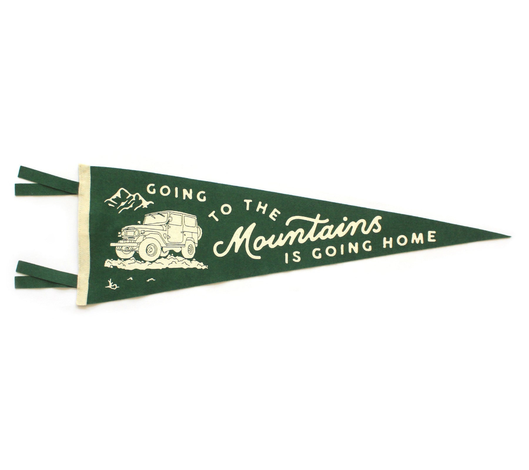"Going to the mountains is going home." -John Muir. A 9" x 27" Wool Felt Pennant by Oxford Pennant. Colors: Cream and Forest Green (Pennant), Cream (Ink).