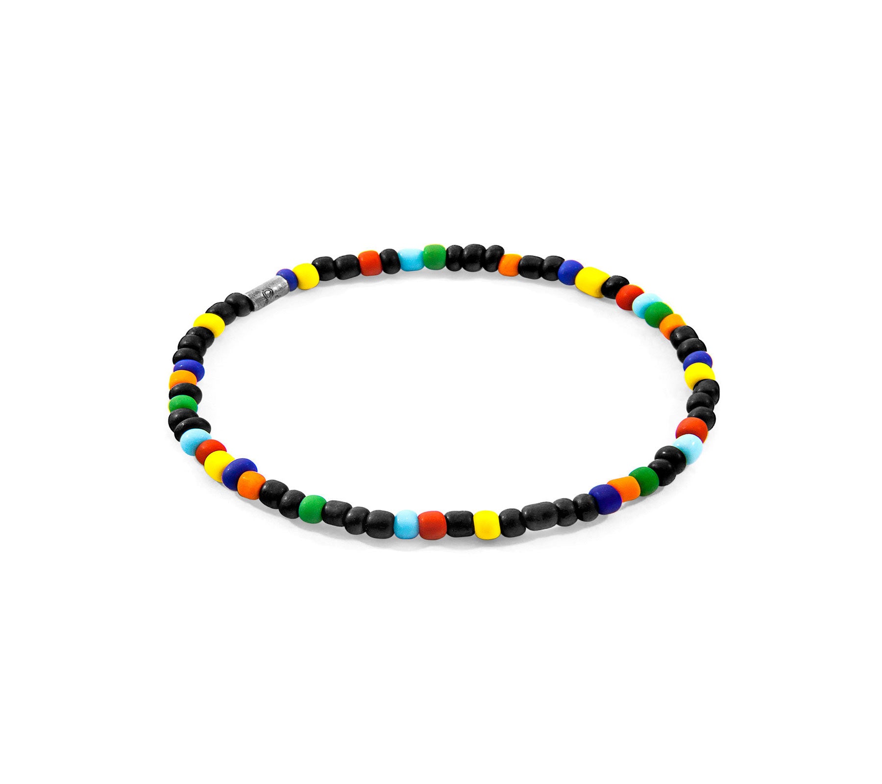 The Multicoloured Jack Silver and Glass SKINNY Bracelet was both designed and skilfully handcrafted completely in Great Britain. Combining British craft manufacturing with a discerning modern-minimalist style, this ANCHOR & CREW bracelet features: 3mm diameter genuine multi-coloured glass stone beads with elastic nylon thread, Solid .925 sterling silver logo cylinder.