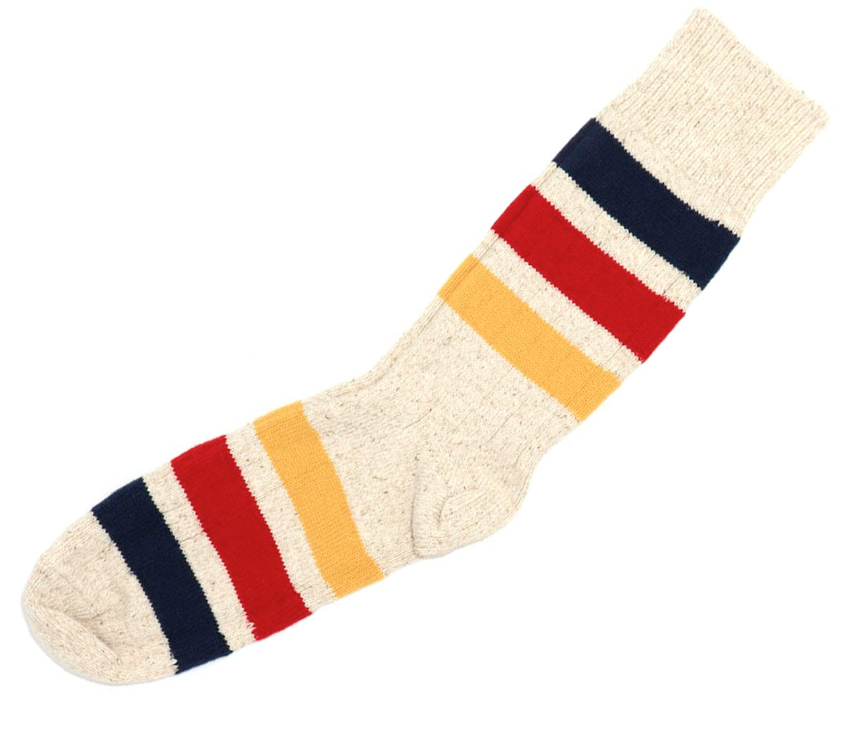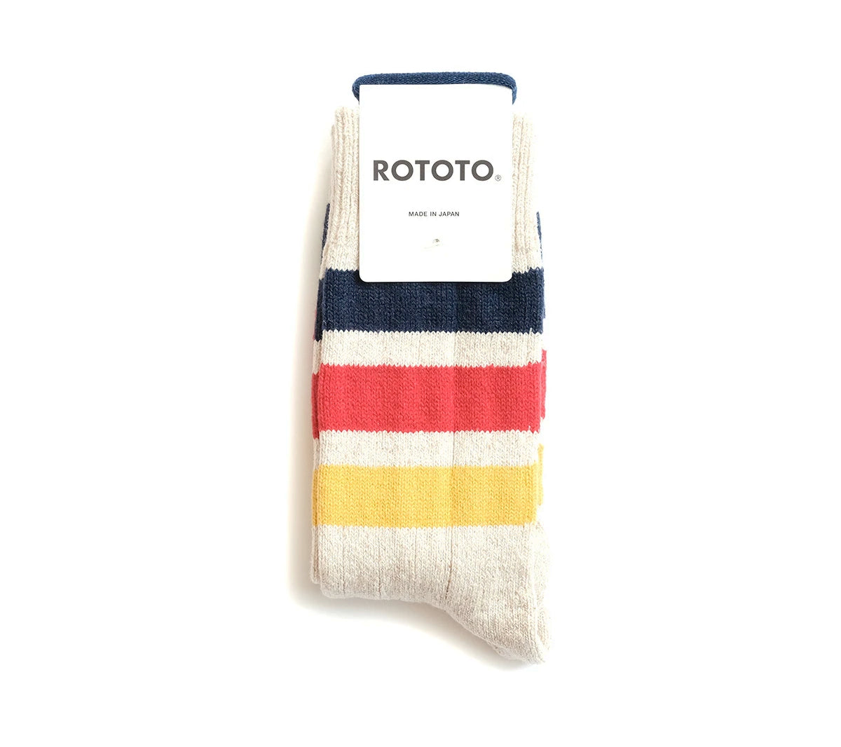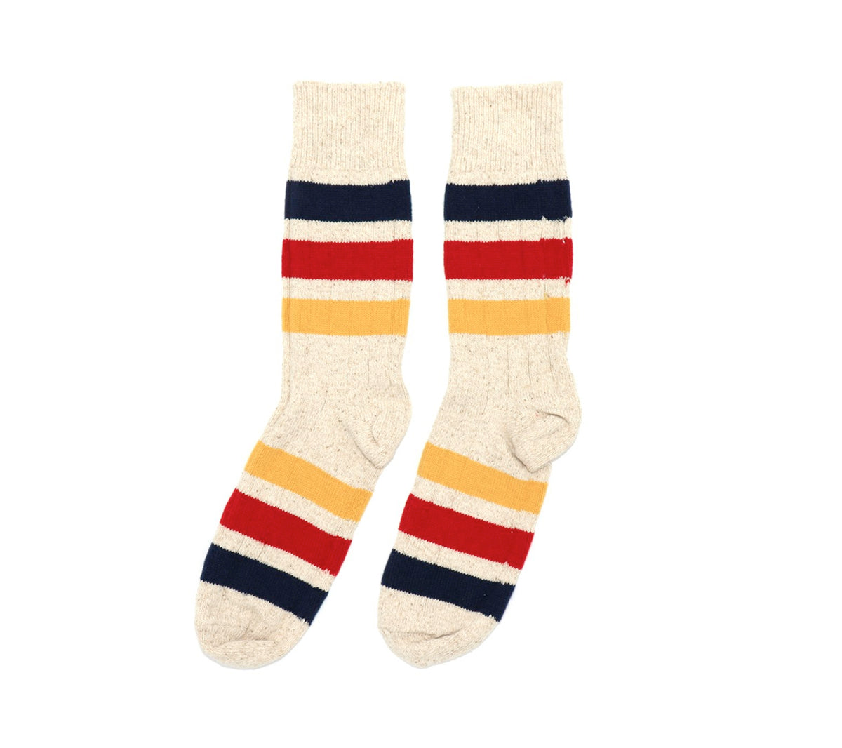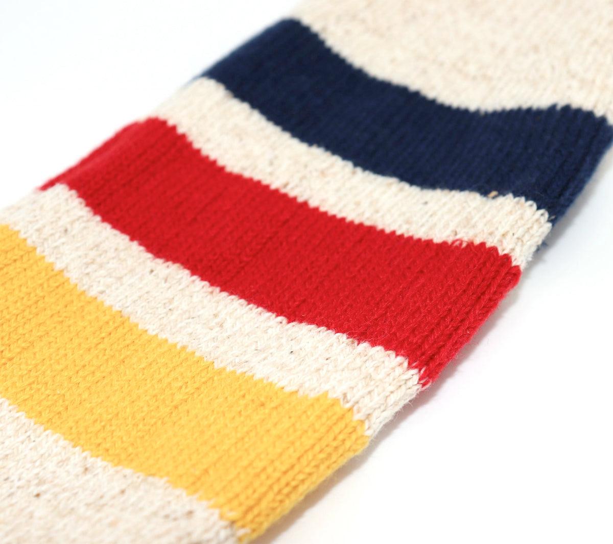 Classic looking sporty sock. This model is the updated version of ‘R1432 PARK STRIPE CREW SOCK’ and knitted with different yarn. The design of these socks is inspired by outdoor blankets, and the rugged fabric with neps is knitted with an old-type low-gauge knitting machine. The vivid stripes on the natural-feel fabric characterize this item. *Avoid tumble drying, as it may cause shrinkage. No. R1501