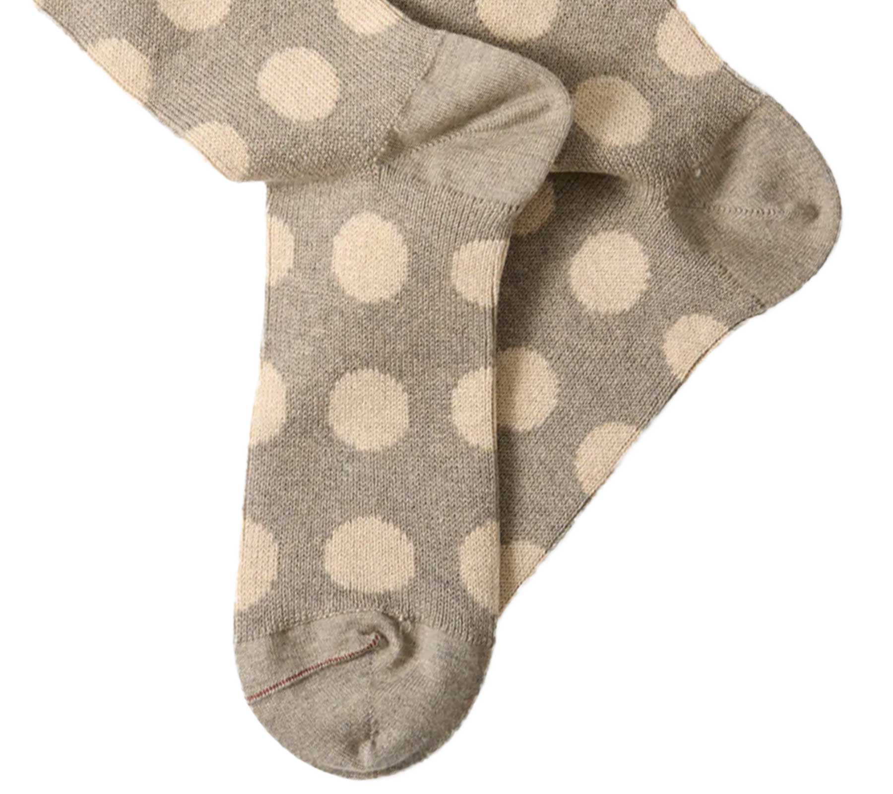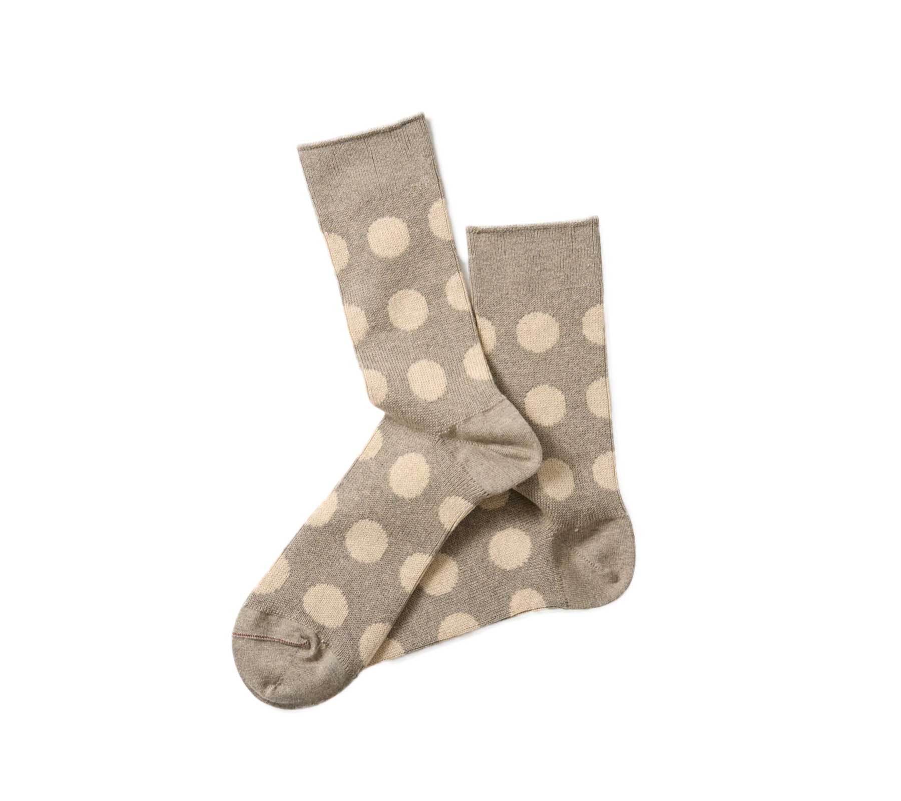 Inspired by the iconic “porthole” windows found in the architecture of Jean Prouvé, a pioneer who shaped 20th-century design, these cotton socks feature a bold yet refined dot pattern. Expertly knitted at a Japanese factory specializing in dress and business socks, they're finished using a seamless linking method at the toe, minimizing bulk and maximizing comfort against the skin. Please enjoy the unique character of each piece, as slight variations may occur across different production runs. Ref. R1628