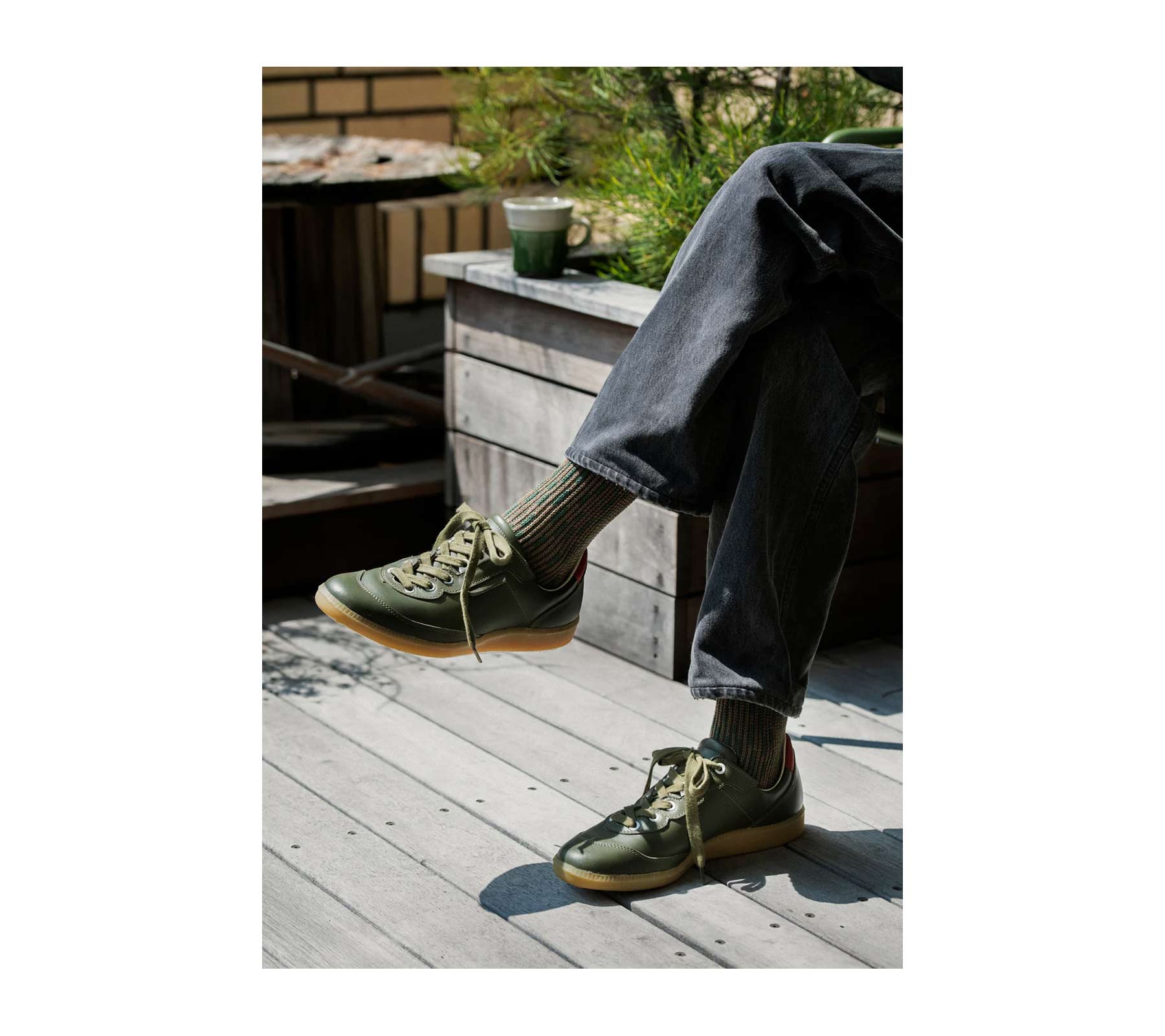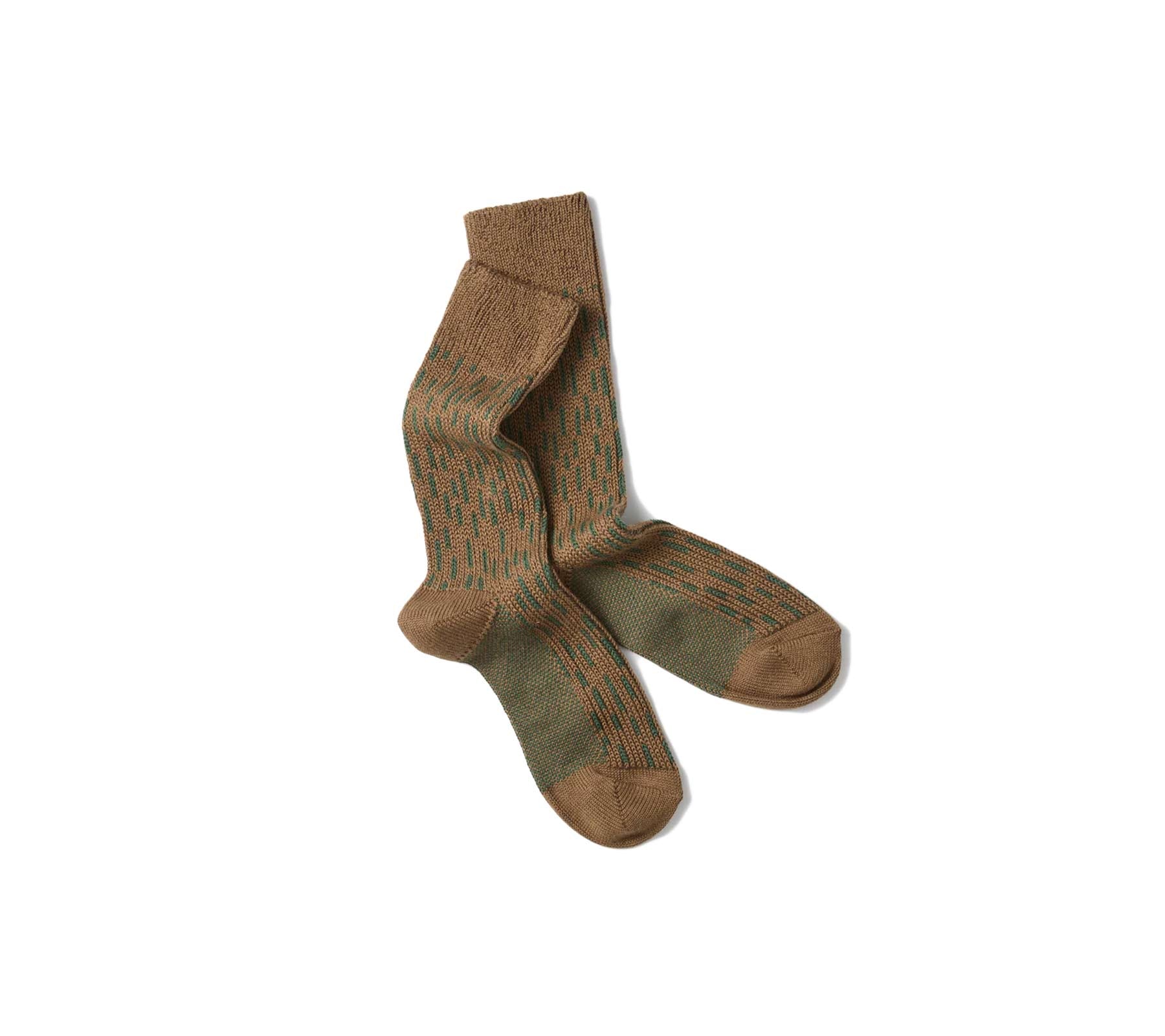 This unique pattern adopted by the East German Army and the Czech Army is now known as the Raindrop Camo because it looks like falling rain. By adding a modern twist to the design, the classic pattern is beautifully knitted in a pair of socks with a bulky knitting machine. With chunky texture, the item naturally blends not just with casual outfits but also for sophisticated looks. No. 1431