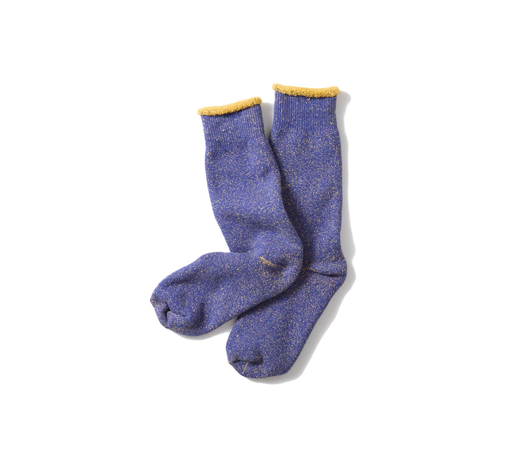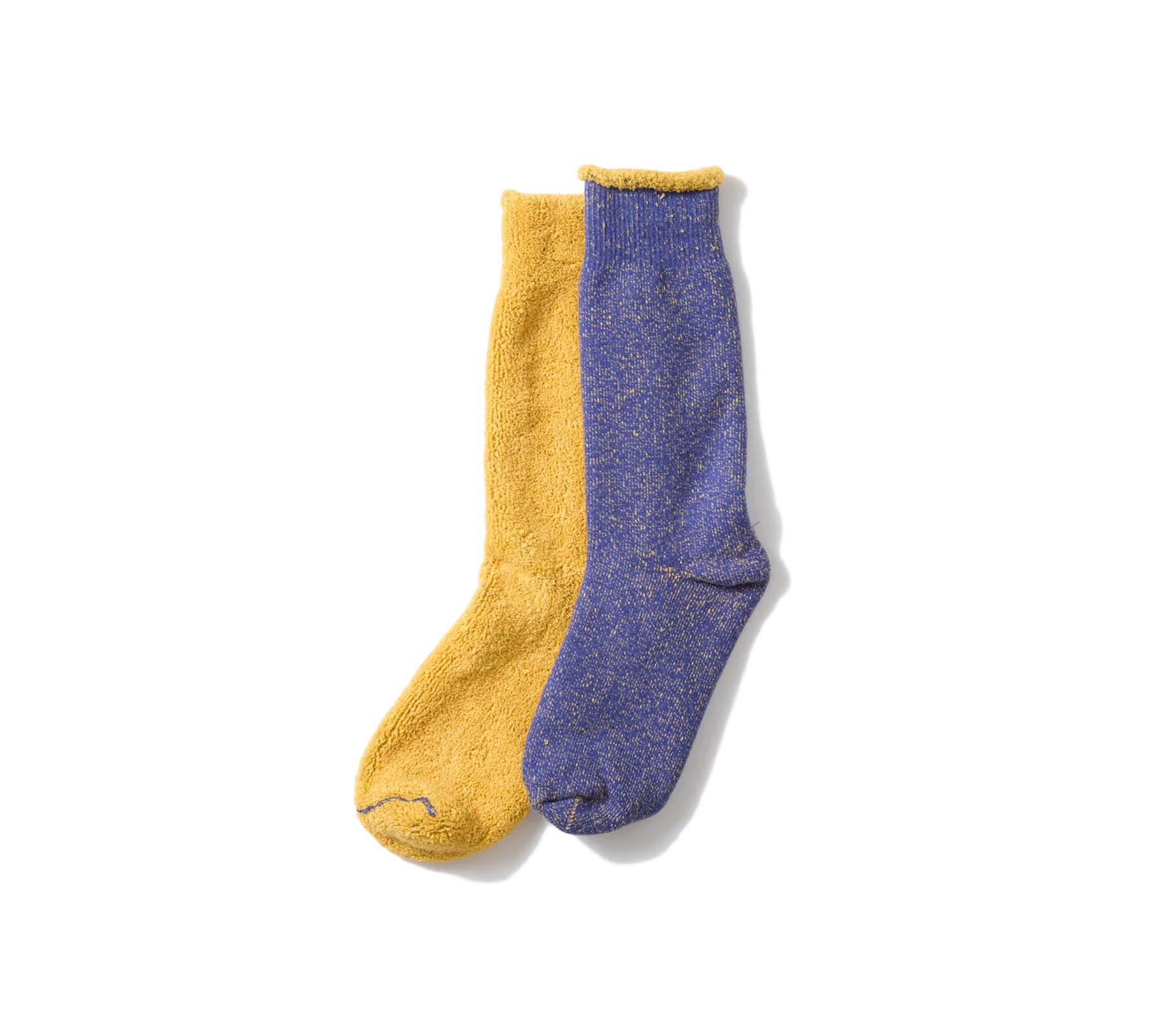As the name suggests, these pile socks are fully reversible and can be worn inside out. The design is inspired by reversible college T-shirts from the 1970s. Knitted on the same machine used for our “R1001 DOUBLE FACE CREW SOCKS,” each pair features contrasting cotton yarns on the inside and outside for a distinctive two-tone look. *Please note that the pile surface is delicate -avoid contact with Velcro or other abrasive materials. Ref. R1612