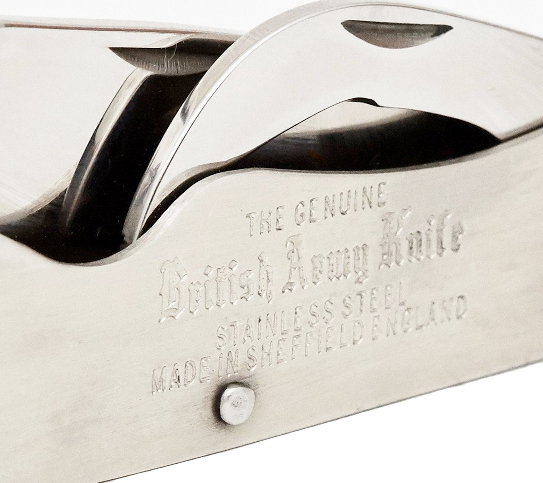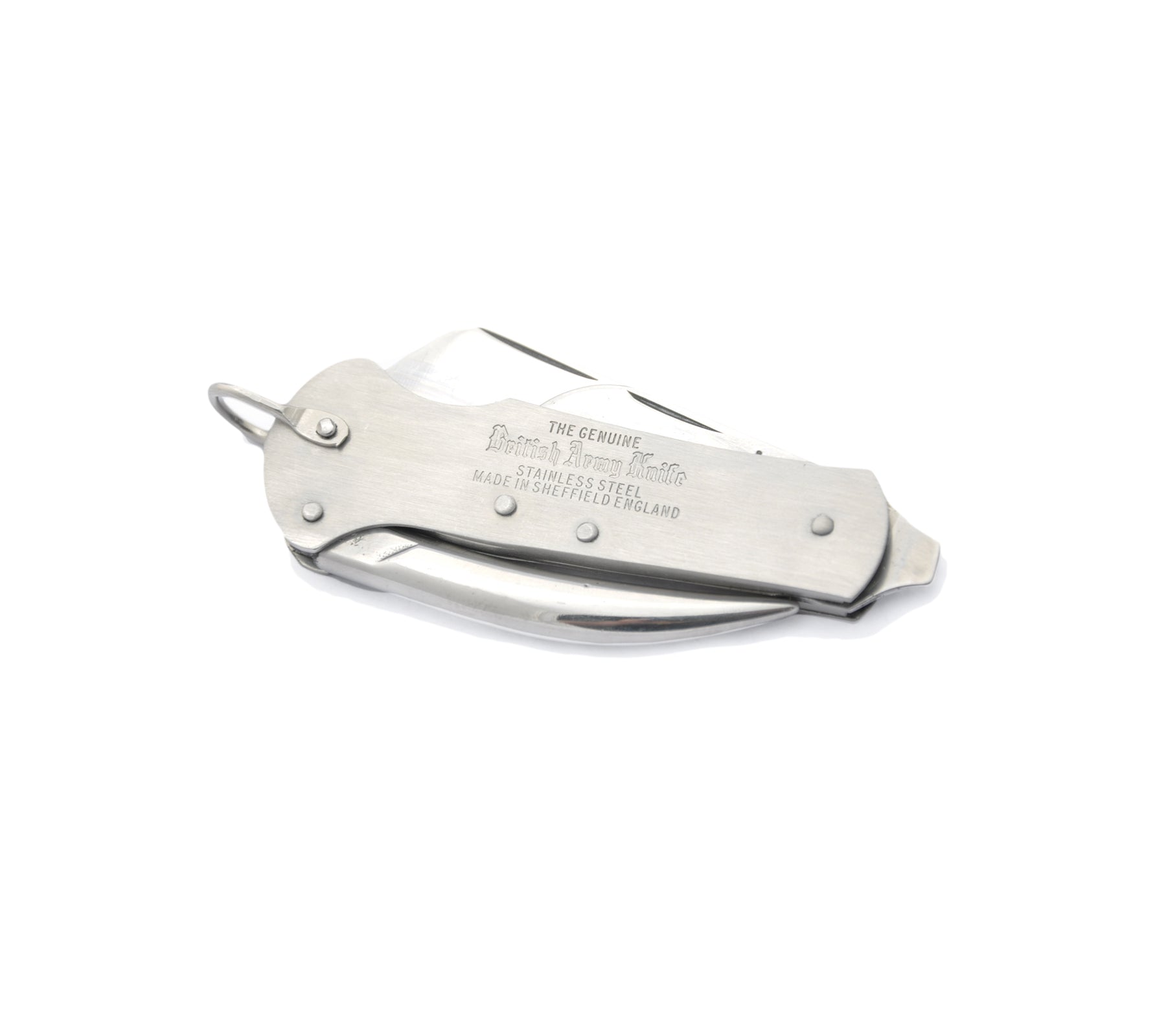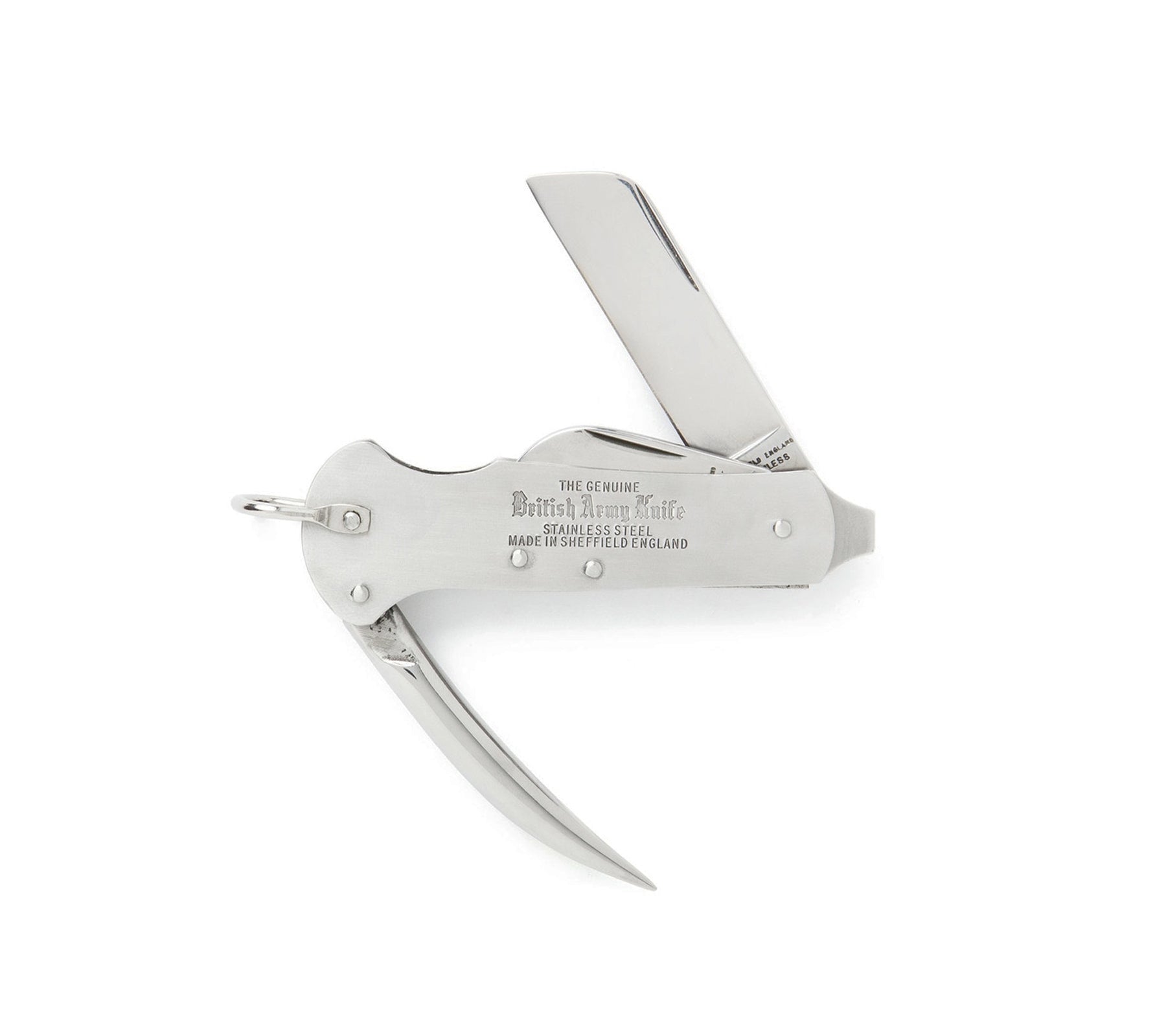 Made in UK from stainless steel. Measures 3 3/4" closed and features a stainless steel Sheepfoot Blade for heavy duty cutting, a can-opener tool and a marline spike for rope work. The handle has an integrated screwdriver and is fitted with a shackle to allow attachment to a lanyard. Stamped on the handle with "The Genuine British Army Knife Stainless Steel Sheffield England" seal.