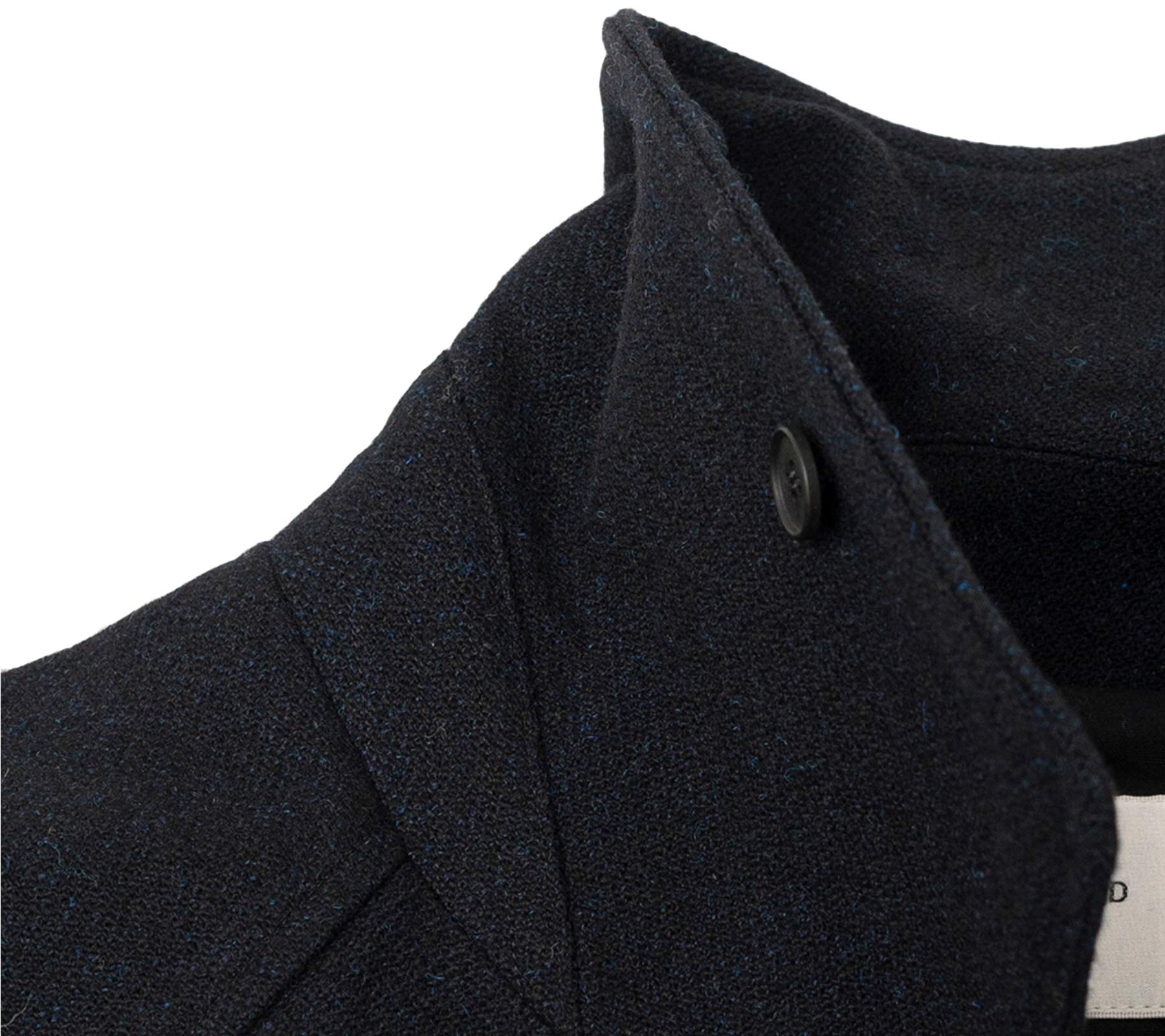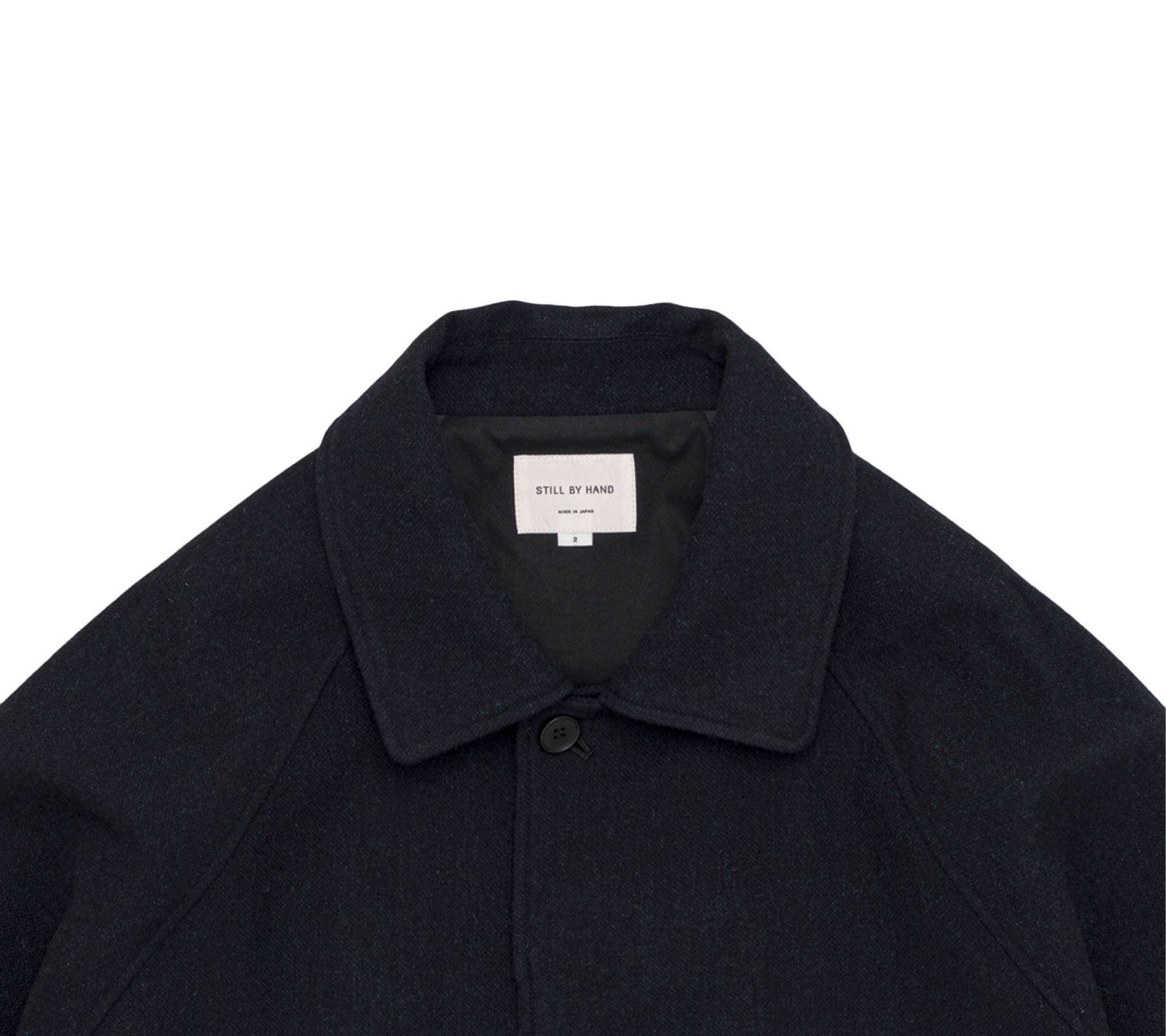 This W/N Bal Bollar Coat in Black/Navy combines expertly crafted fabric and thoughtful design details for enduring style. Made from the brand’s original 90% wool, 10% nylon tweedy fabric produced in the Bishu region, it offers a densely woven, dry, and rigid texture that feels structured on the skin while delivering a clean, classic appearance. The coat features a self-standing rigid collar and chin strap, a fly front with concealed buttons, wide armpits with roomy sleeves, and large front pockets with flaps. Additional functional touches include a sizable back yoke, adjustable buttoned sleeve straps, and a drawstring at the hem for customizable fit.