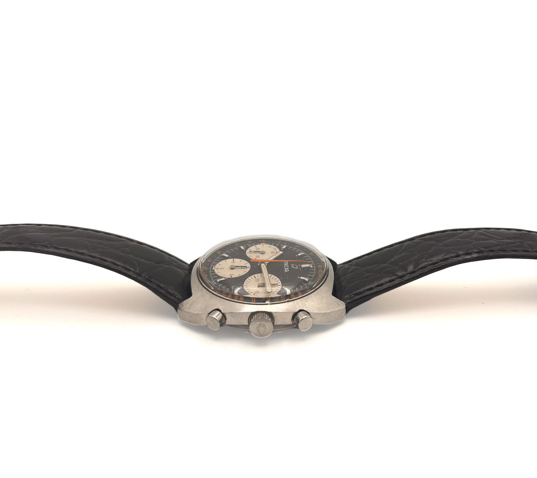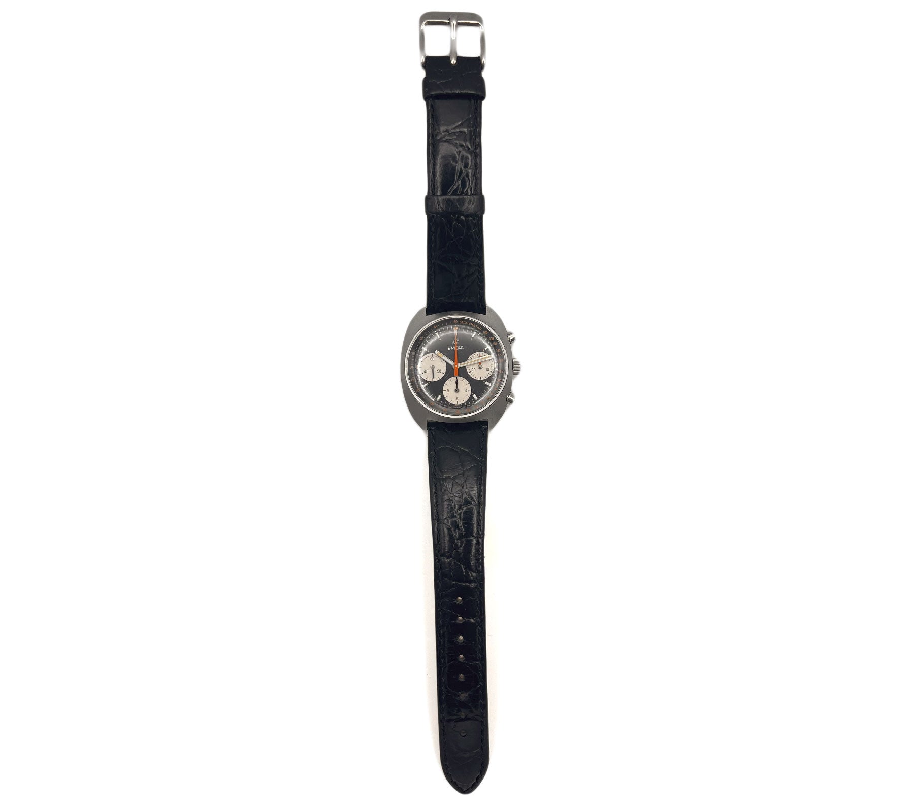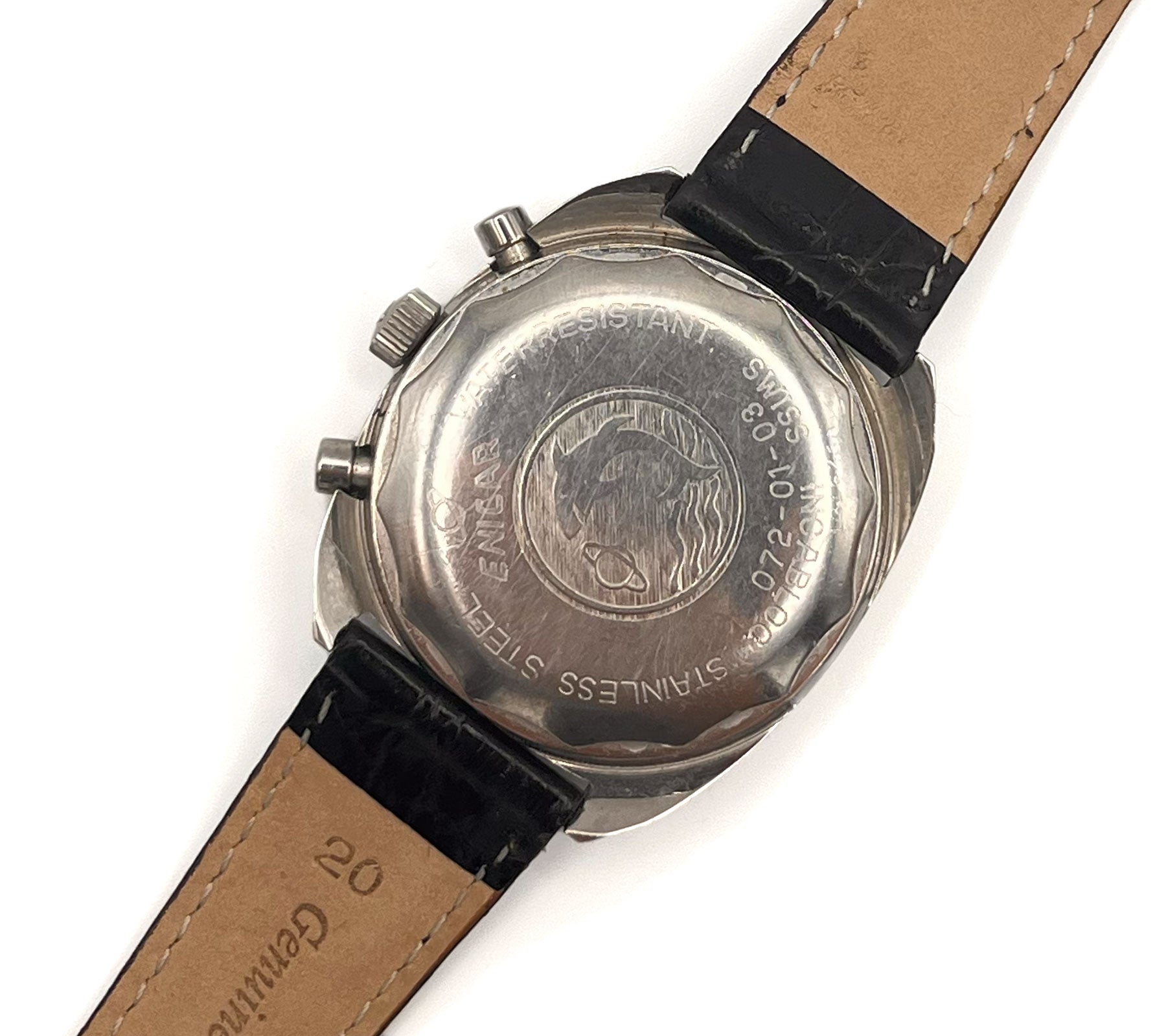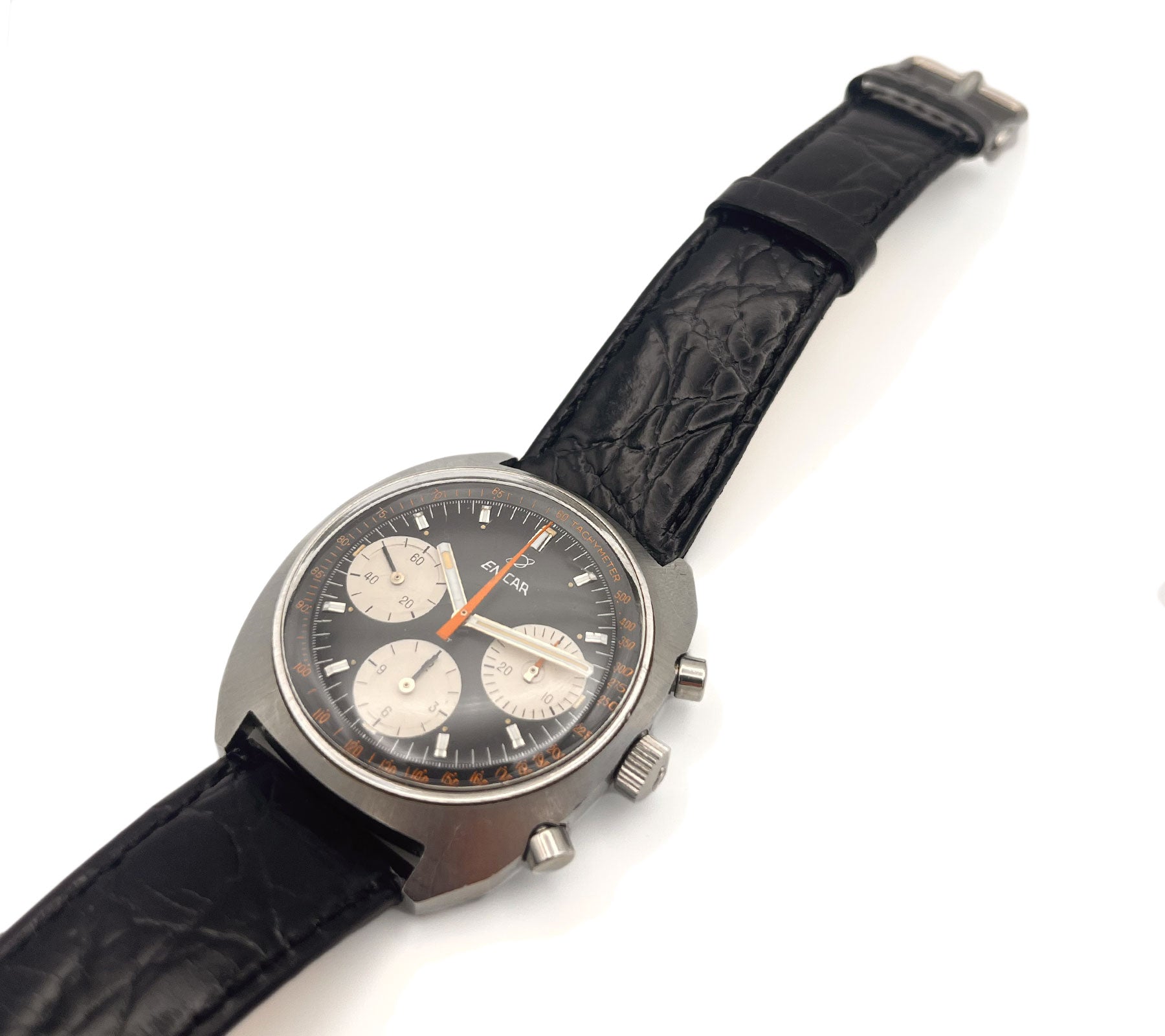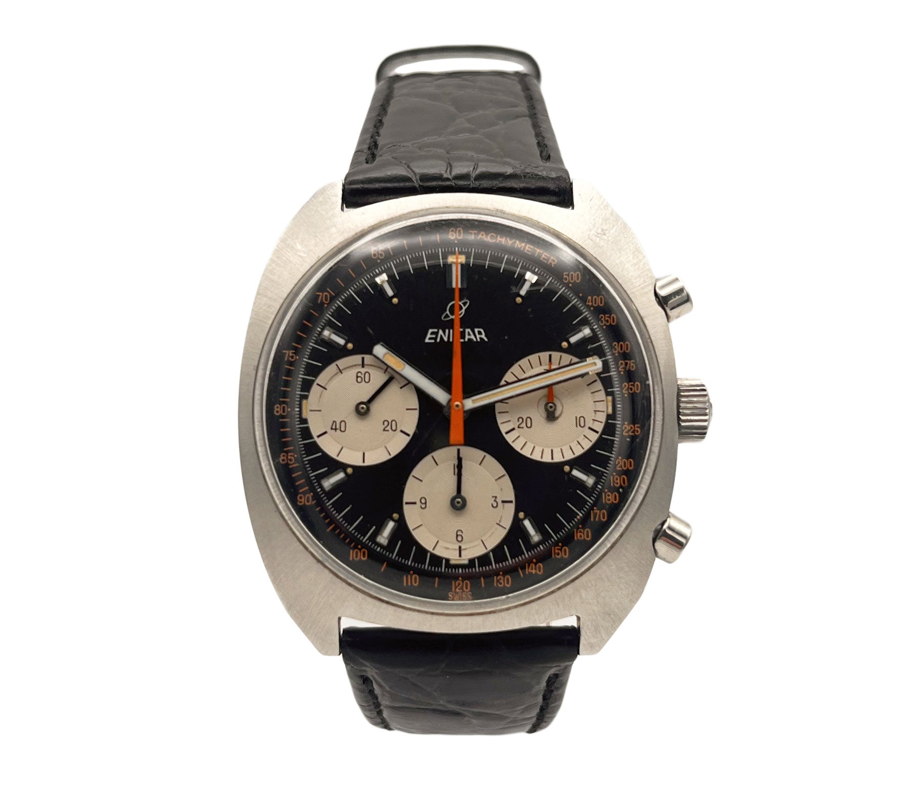 Ce chronographe Enicar vintage des années 1970 est une pièce audacieuse et distinctive, signée par l’un des horlogers suisses les plus innovants du milieu du XXe siècle. Équipé du fiable mouvement à remontage manuel Valjoux 72 (utilisé notamment dans la Rolex Daytona), ce modèle présente un robuste boîtier en acier inoxydable, une lunette tachymétrique, ainsi que des accents colorés sur le cadran, caractéristiques du langage esthétique audacieux d’Enicar à cette époque.