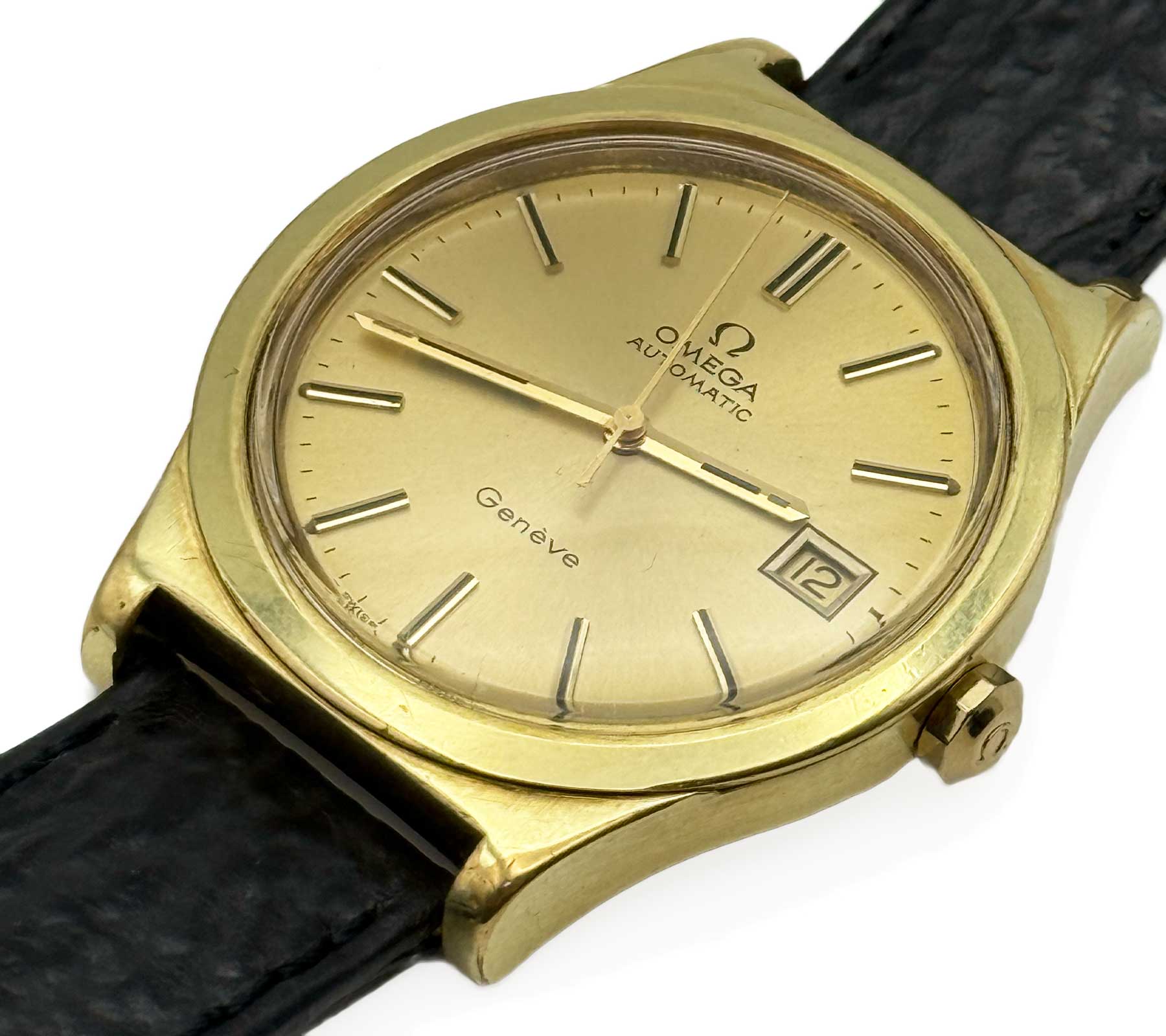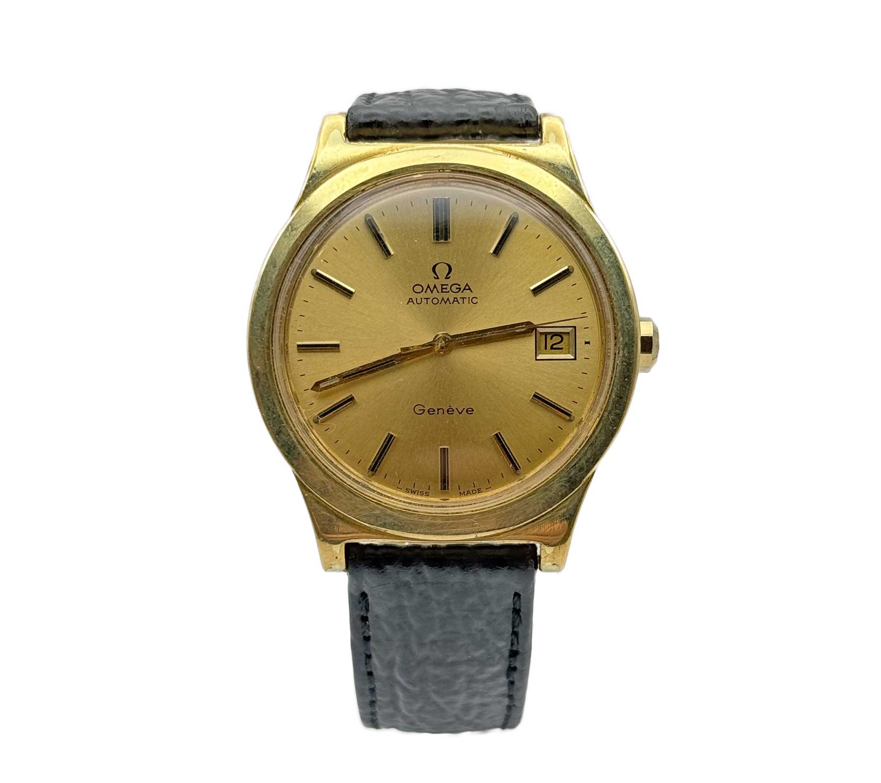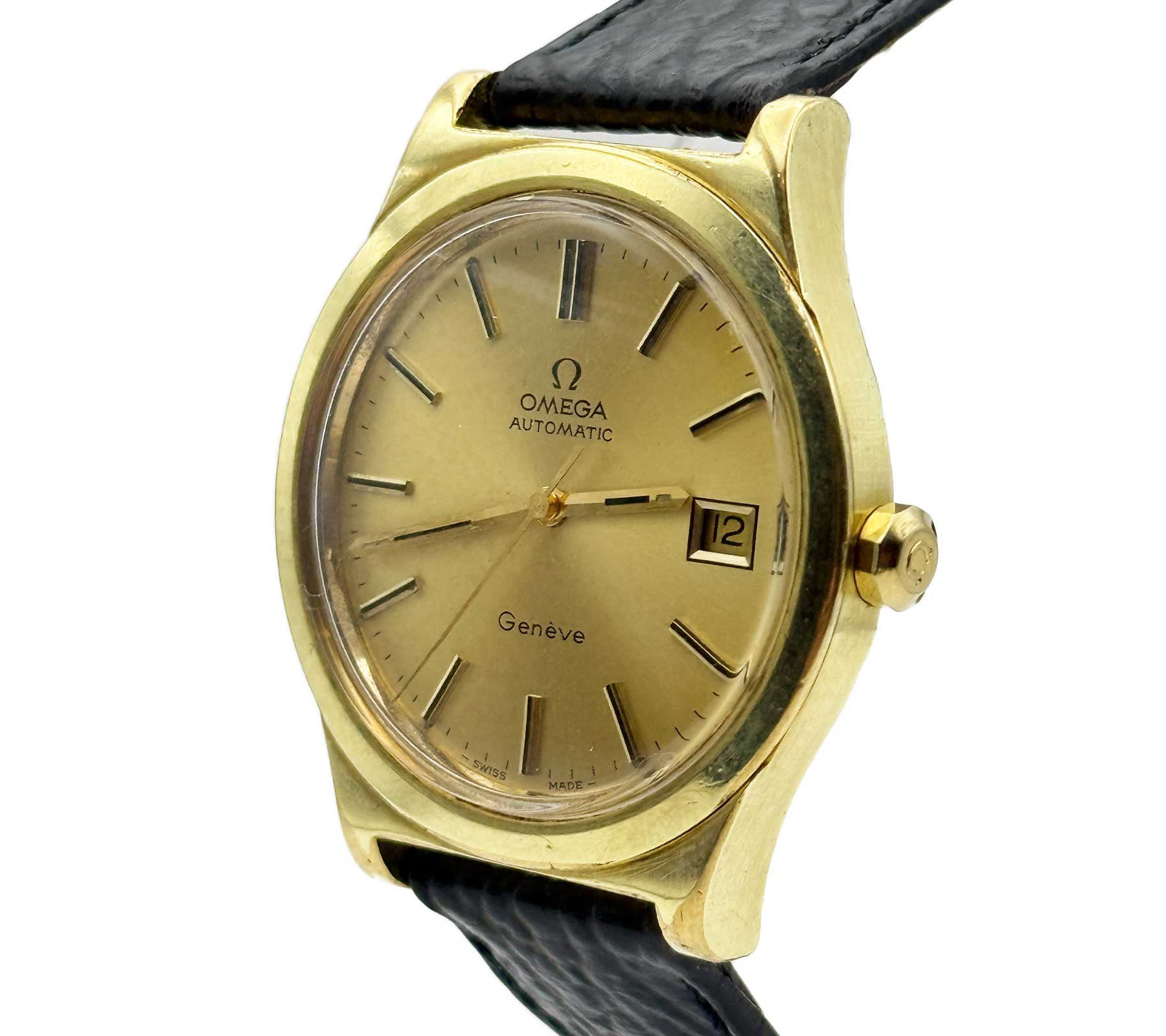 The "Omega Genève 'Jumbo' ref. 136.0102... Often described as "Jumbo" or "Oversize" due to its larger case size and was part of the Omega Genève collection from the 1970s. It is known for its manual winding movement and features a date complication, in a gold case with gold dial.