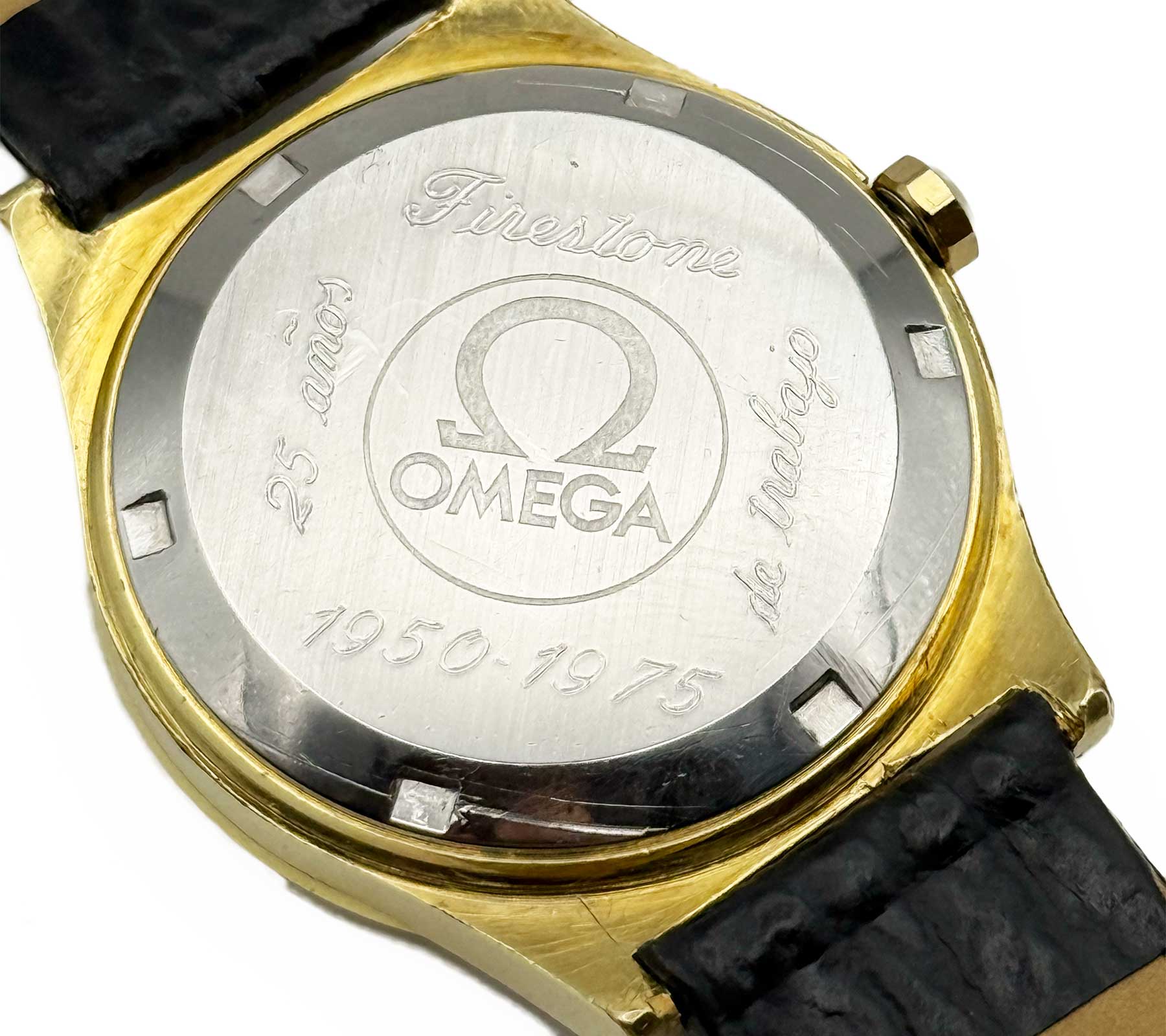 Description: Popping gold dial and case, this is a rather large 36mm watch, especially for the 1970s. In lovely vintage condition, it stands out on the wrist. The case features an engraving at back, for 25 years of service at Firestone (nice anniversary gift!).