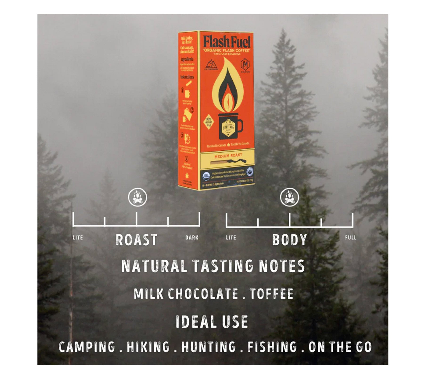 Note : Flash Fuel est un mélange de café instantané CHRC et de micro-mouture, offrant un café au goût riche et délicieux. Bien que l'instantané soit totalement soluble dans l’eau, la micro-mouture laissera un léger dépôt au fond de la tasse (semblable au café des cowboys). Si vous vous sentez particulièrement aventureux, n’hésitez pas à boire le résidu, sinon, jetez-le.