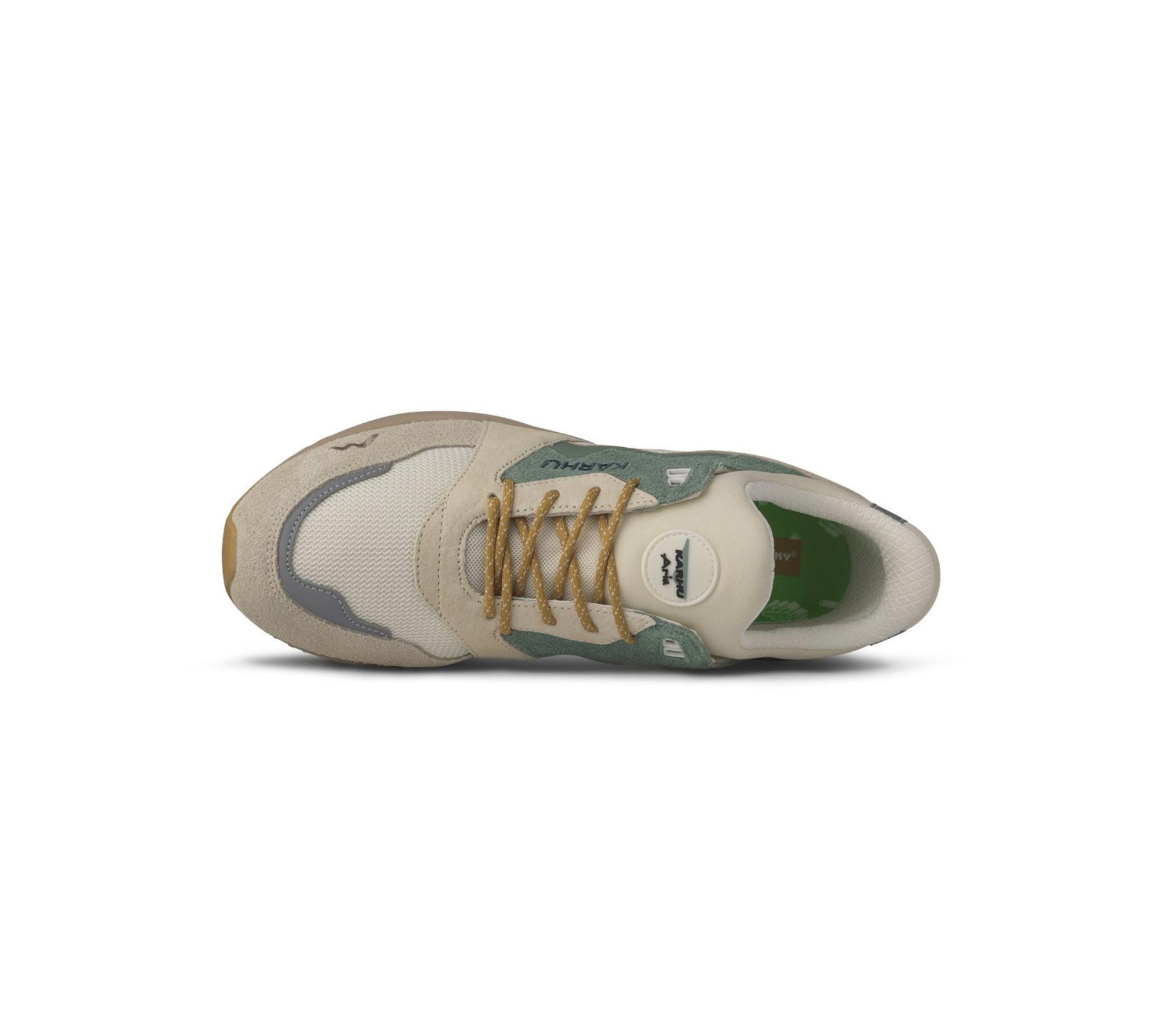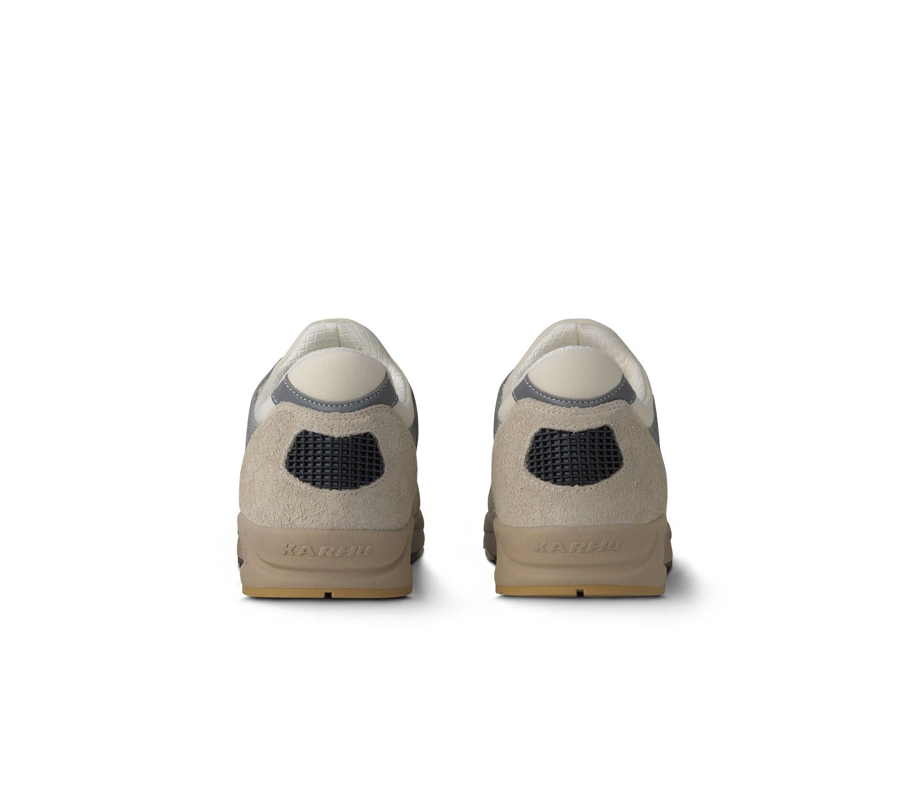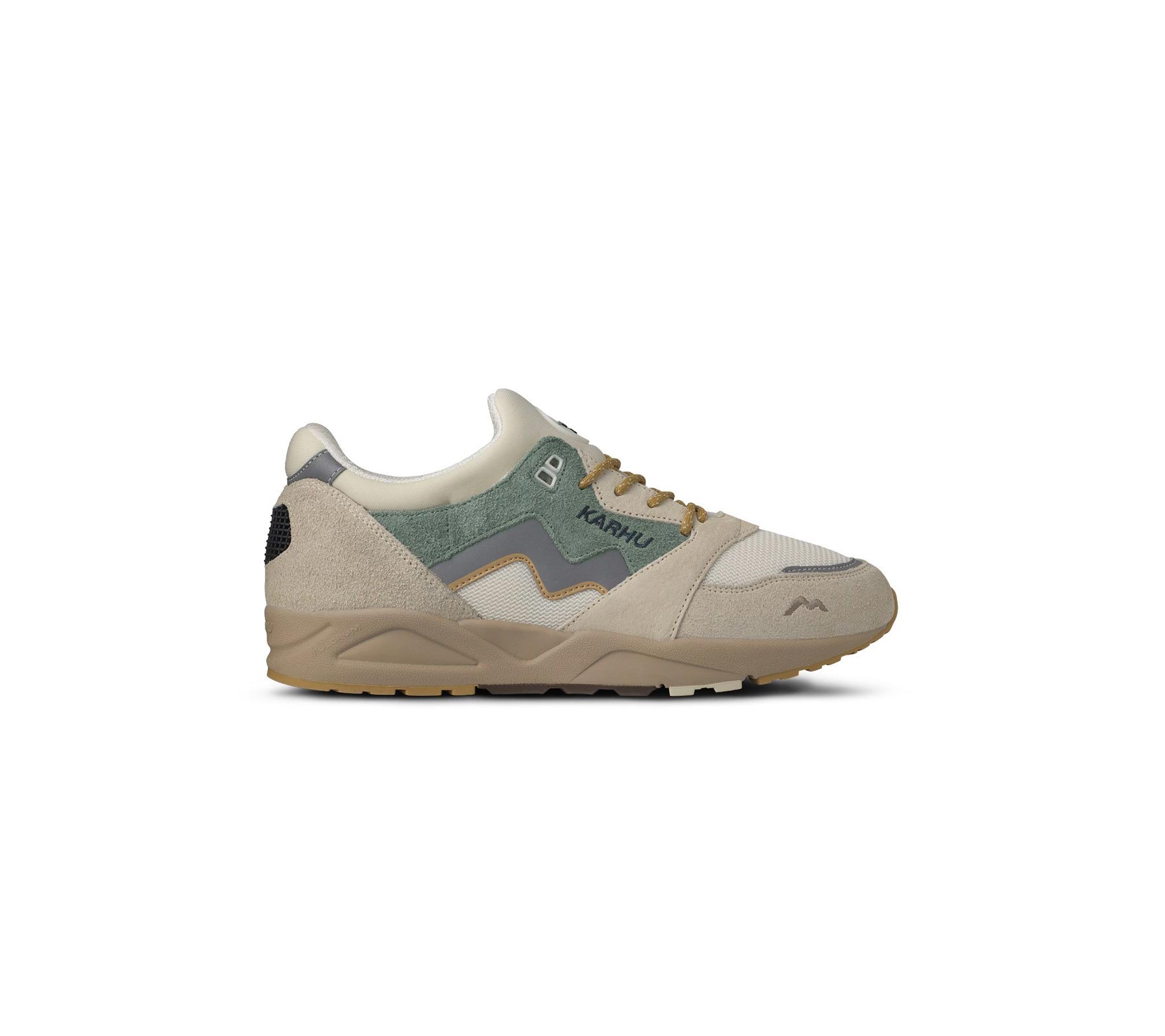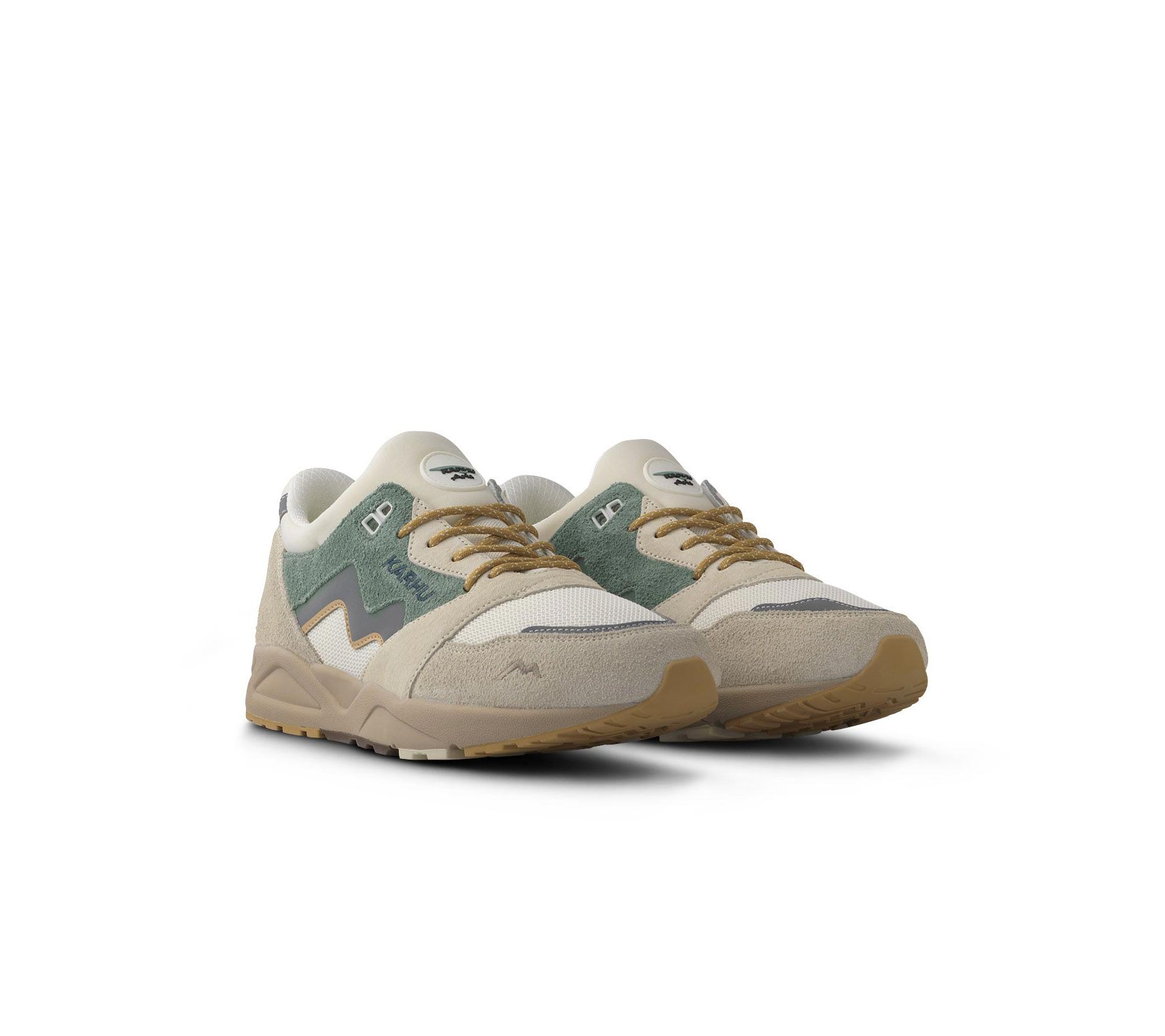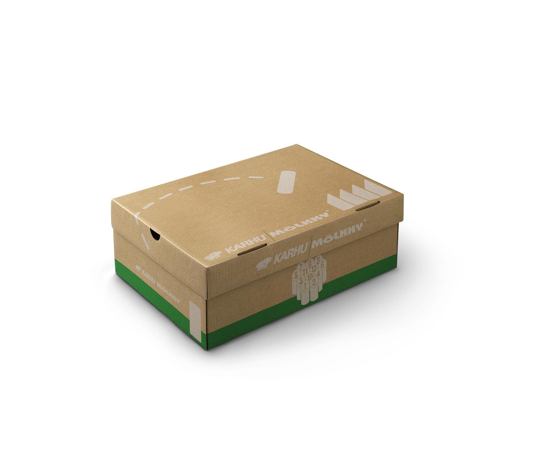 Key details of the KARHU Aria 95: Lycra mono-tongue construction - hairy suede overlays - Different kinds of mesh panels - Rope laces - Reflective details - Speckled midsole - Embroidered M-logo. - Special edition MÖLKKY® Pack footbed. - Special edition MÖLKKY® Pack shoebox.