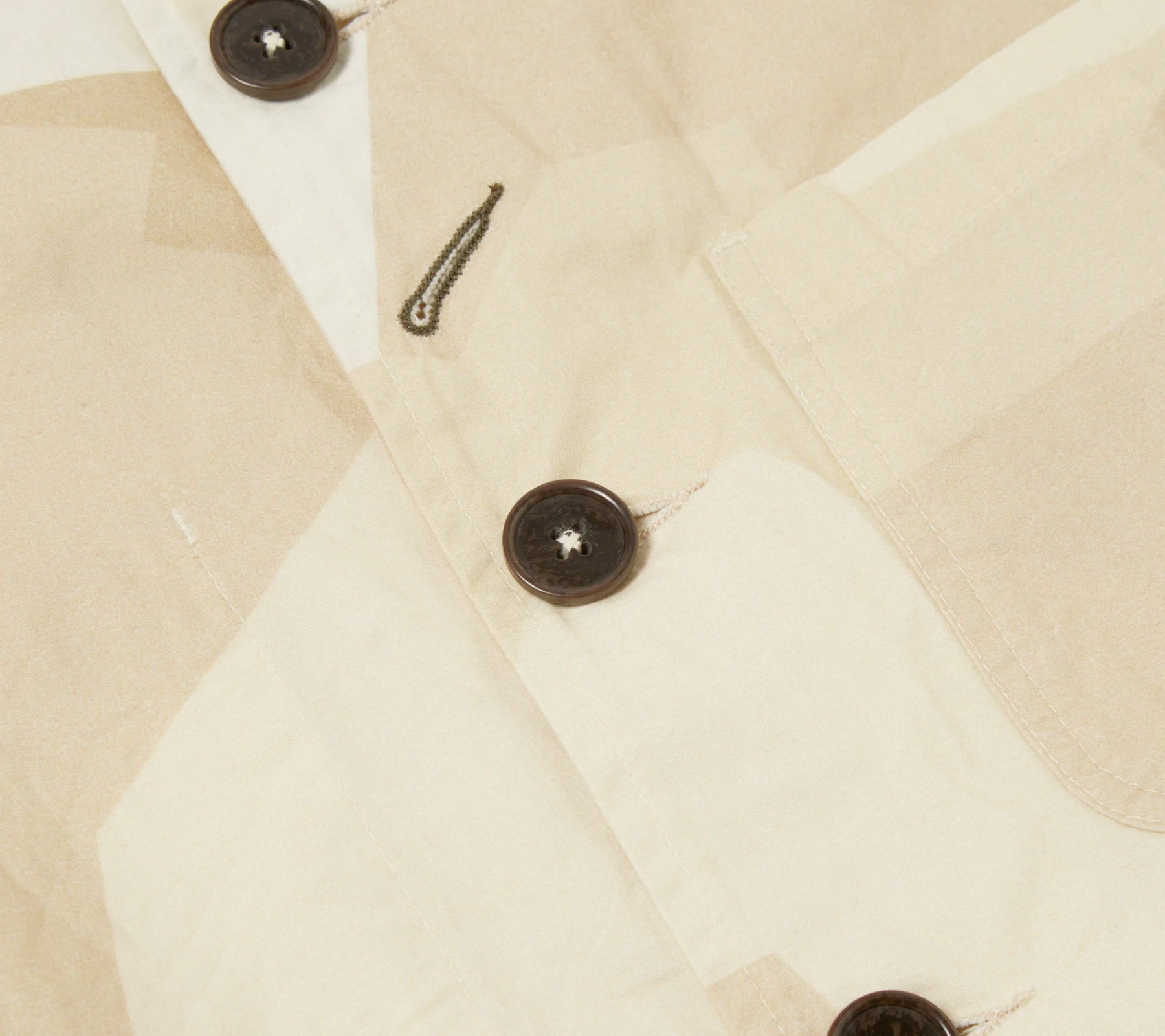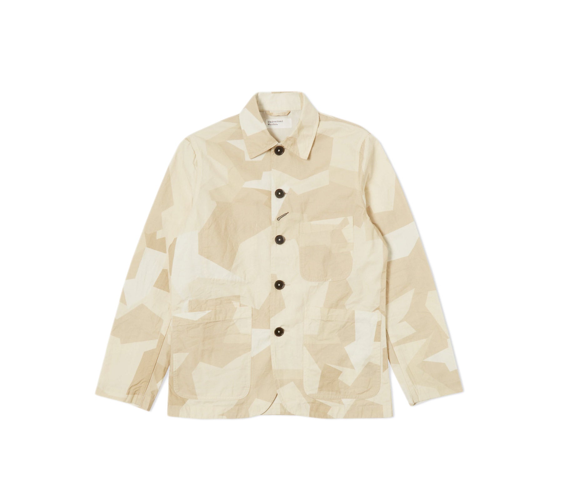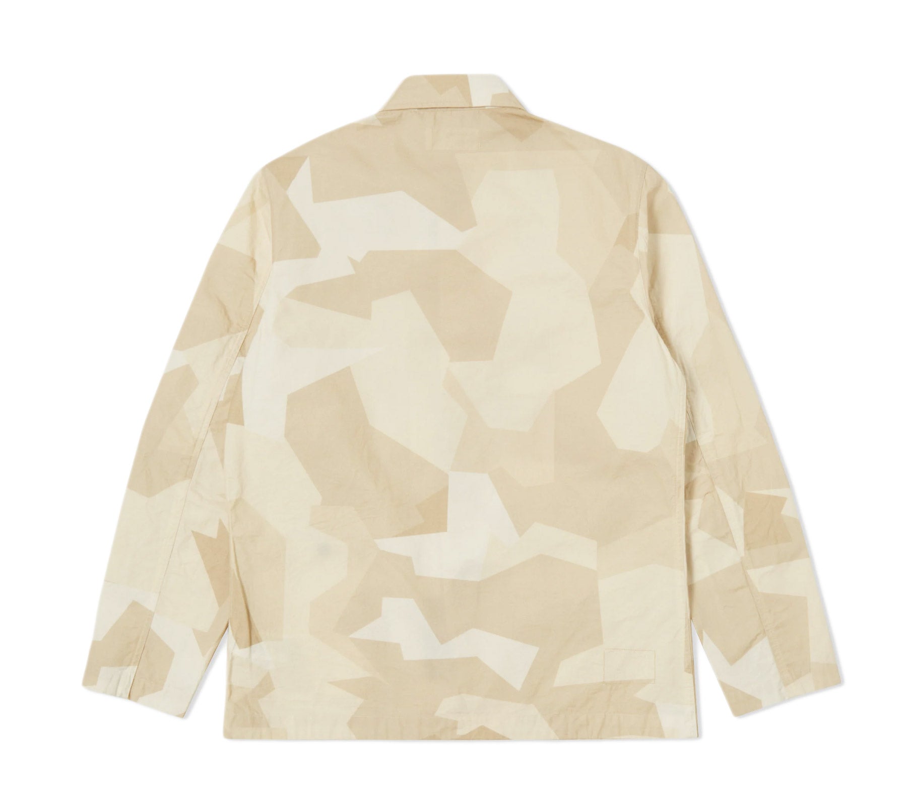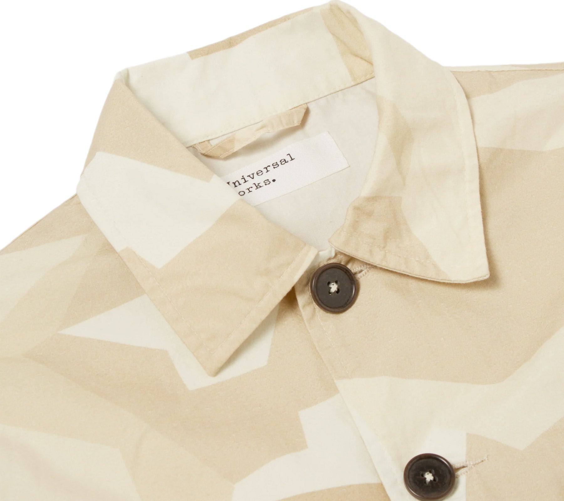 The original and still the best, classic work jacket. An exciting, yet classically inspired lightweight waxed water-resistant outer shell. This is a long-lasting durable cloth with a Swedish camo print by Halley Stevensons of Dundee, Scotland. Features: regular fit, five button front., two lower patch pockets, one chest patch pocket, one internal chest pocket & one internal hip pocket.