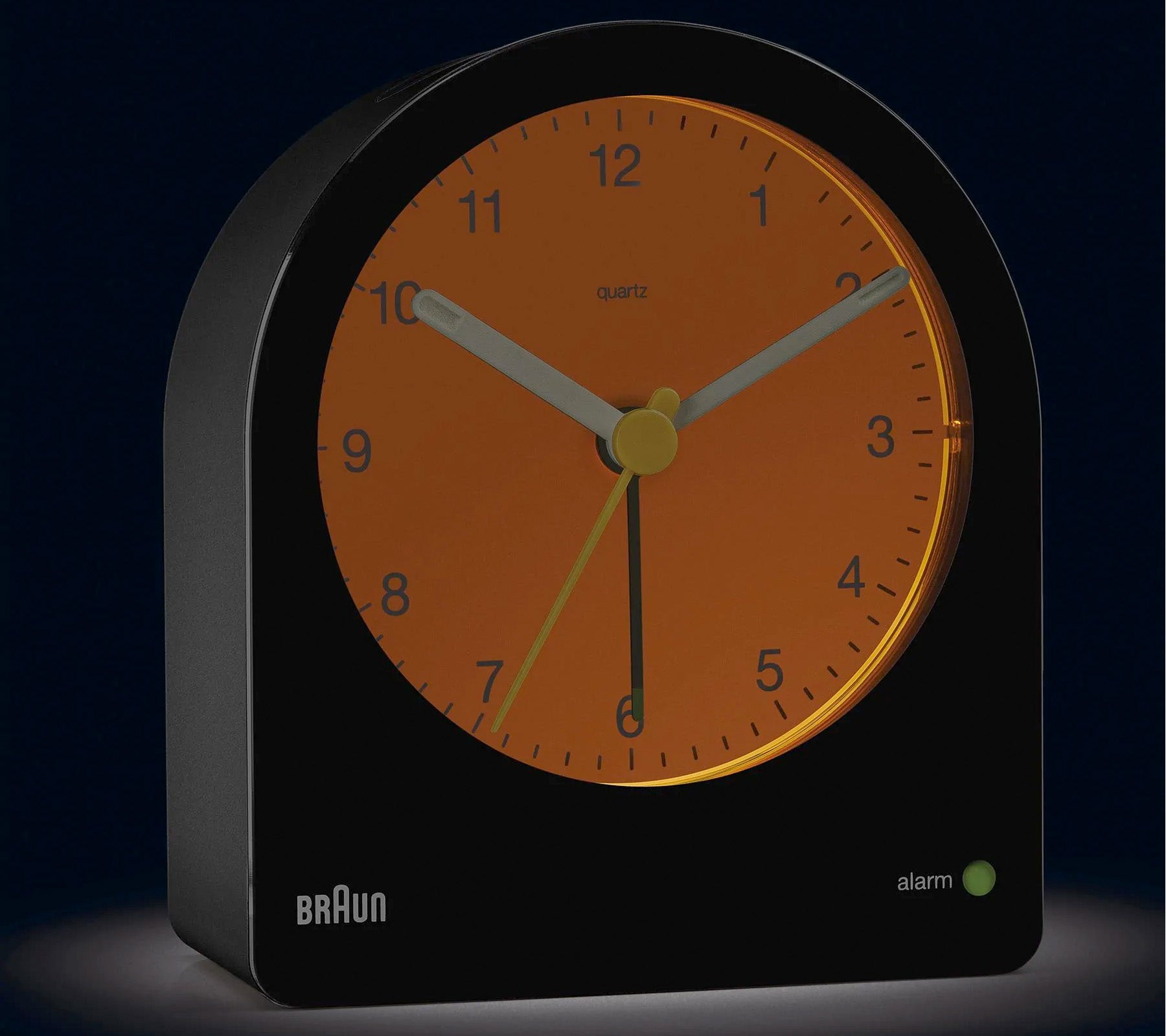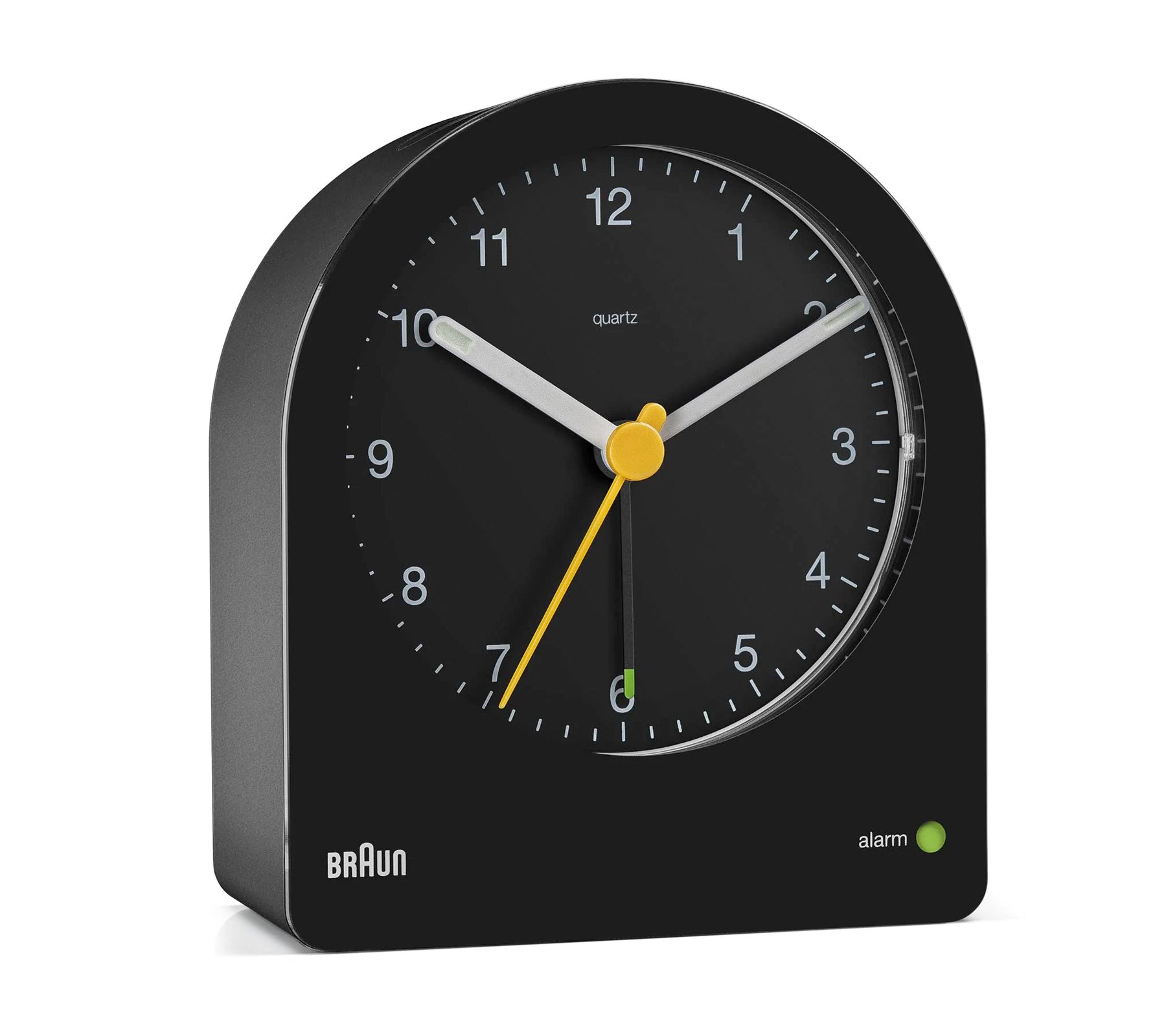 The BC22 Classic Analogue Alarm clock is unique in form. Its silhouette is derived from the AB 2 clock designed in 1984 by Dieter Rams. The clean simplistic dial and contrasting hands that feature luminous tips offers great legibility. The addition of the iconic yellow second hand is synonymous with Braun’s award-winning design history and long-lasting aesthetics. As with all Braun products, the emphasis is on prioritizing usability and functionality and this is perfectly illustrated by the continuous backlight function that subtly illuminates the dial when in low-light environments. The unobtrusive backlight aids legibility, resulting in effortless time reading at night. This function can also be disabled by the user. Among it’s features are a snooze and light function, as well as a crescendo beep alarm that once set is visible on the clock face with a green indicator. Dimensions: H97mm x W85.6mm x D42mm