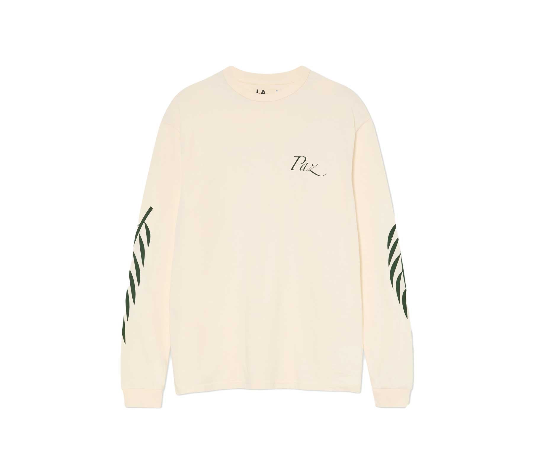 A clean-cut long sleeve t-shirt with a Paz logo and sleeve print. Not much more to say but you'll love it. A soft long sleeve T-shirt... warm and playful layer for the changing seasons. Midweight 100% cotton fabric, regular fit, true to size and pre-washed to minimize shrinkage.