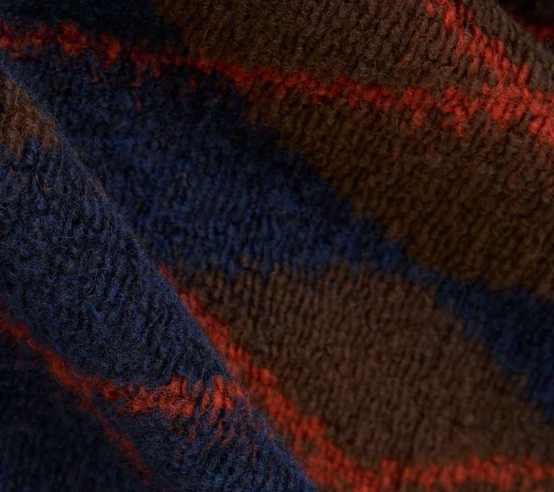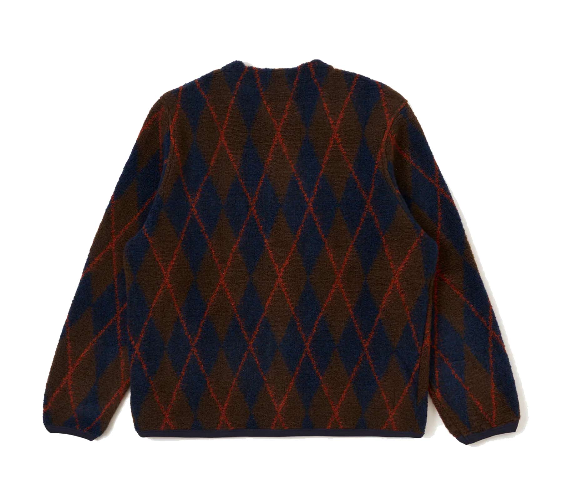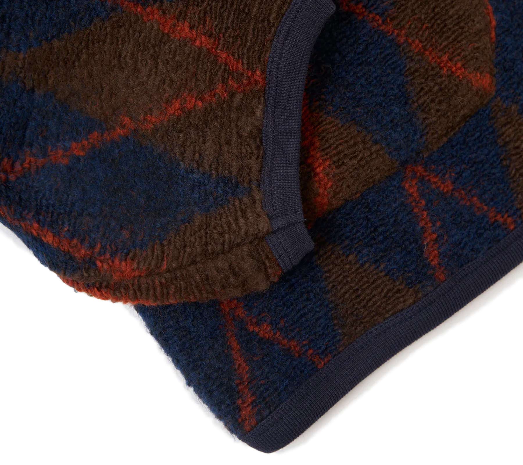 An exclusive colourway in-house designed exploded Argyll pattern, in a boucle yarn creating a bobbly surface texture. Fabric Composition: 30% Recycled Polyester, 27% Polyester, 24% Wool, 19% Acrylic.