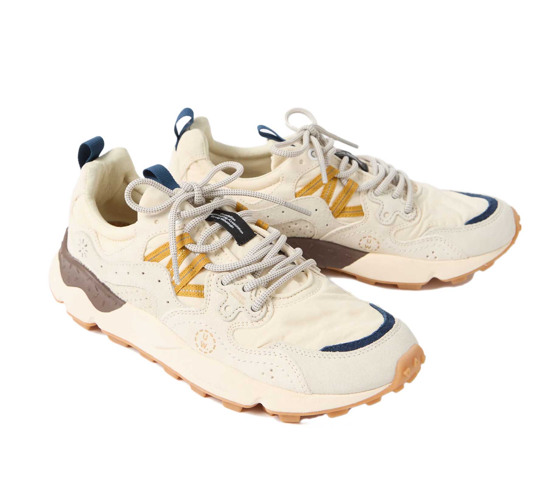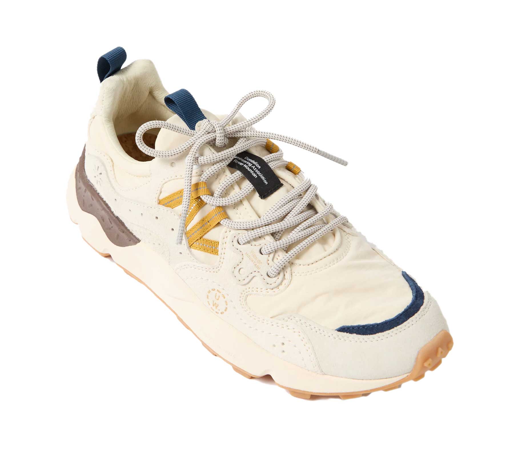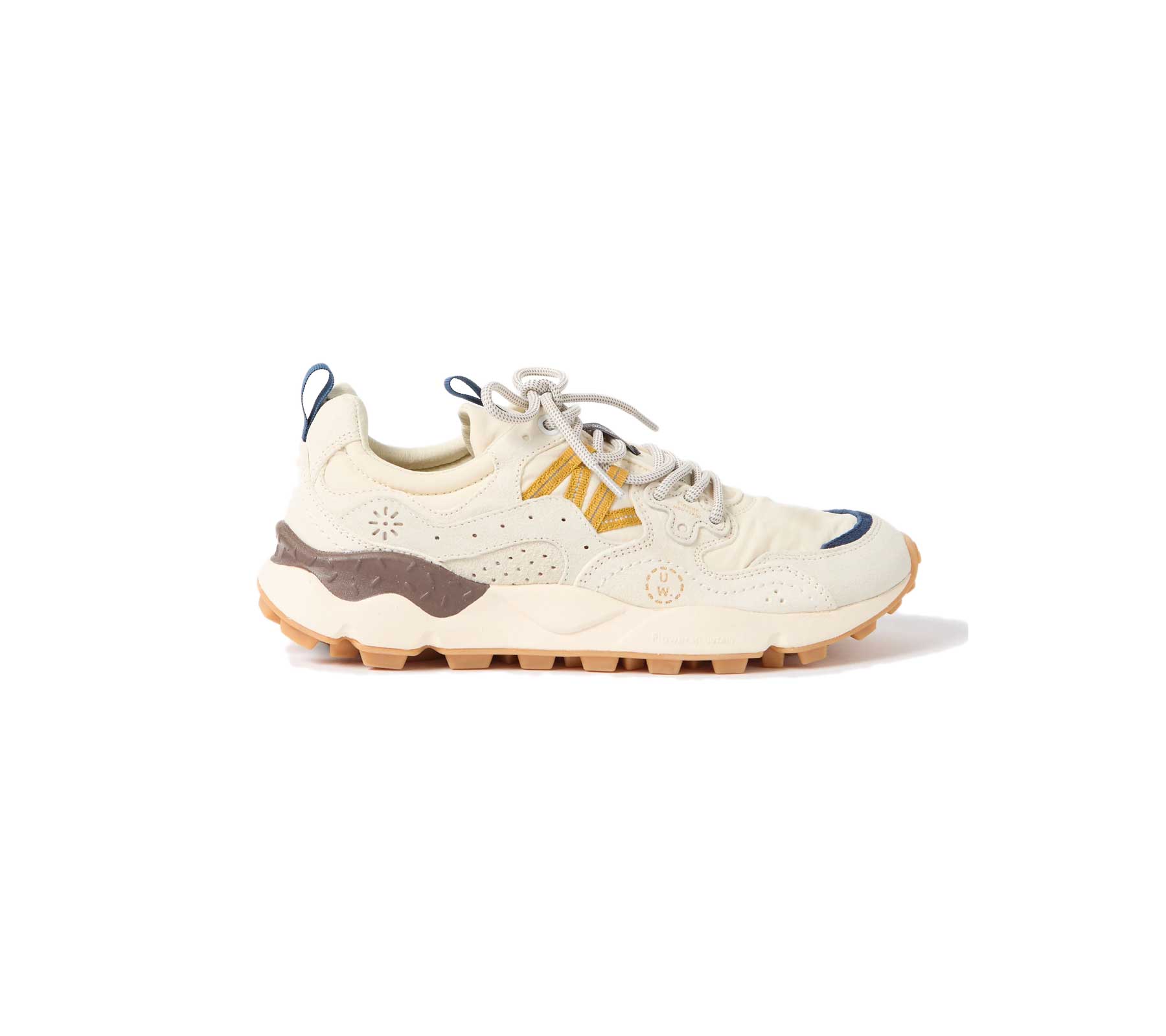Embroideries inspired by the dandelions of Mount Fuji adorn these sneakers crafted from natural materials and enriched with exclusive details, striking the perfect balance between tradition and modernity. The Yamano 3 is Flower Mountain's take on a classic low-rise sneaker. With a technical mesh upper, perforated suede and recycled nylon panels, anatomical and antimicrobial cork insole and signature notched edge rubber sole for grip.