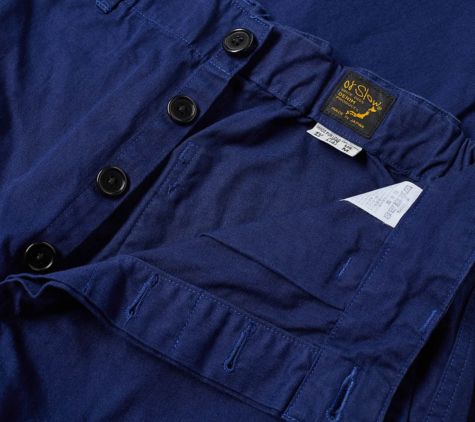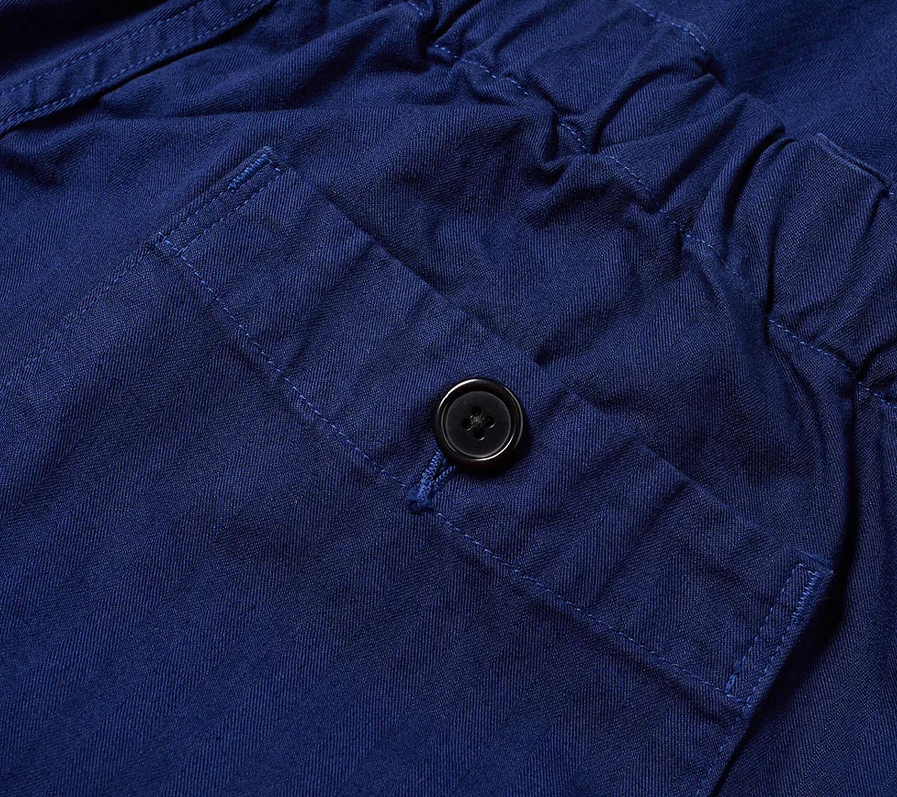 The French Work Pant is old school workwear, a classic chino pant with elasticated waist band and contrast stitching on the inside of both leg seams. Functional pockets throughout, they are made from a durable cotton with a subtle herringbone texture. Straight leg, not too large.