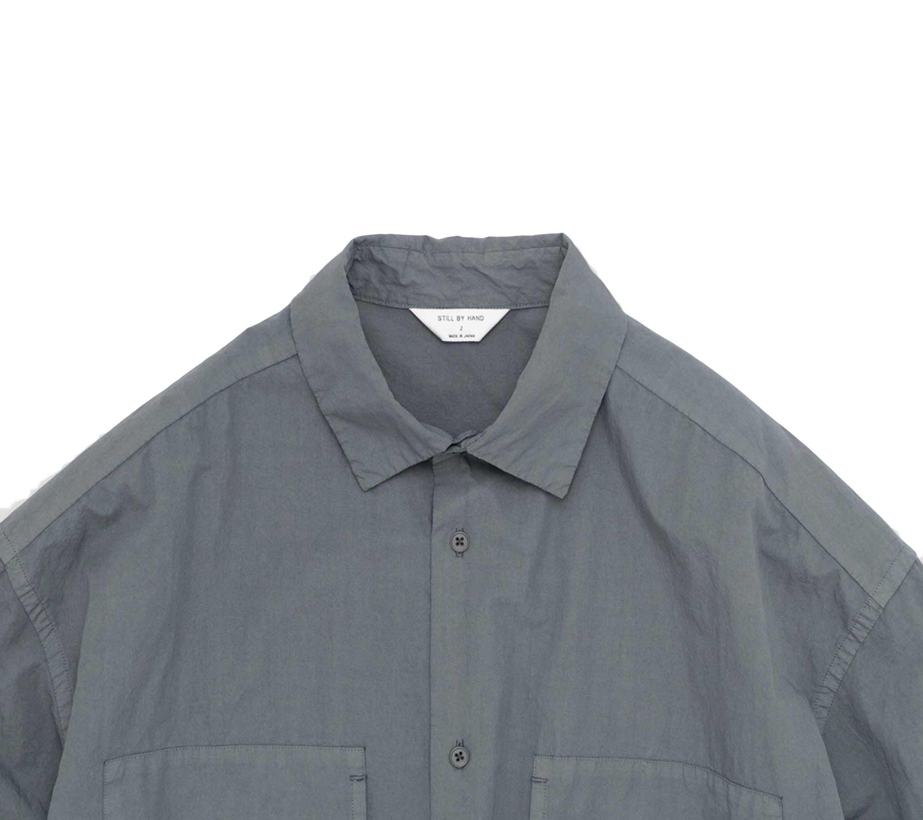 Crafted from 100% cotton peach skin fabric produced in Hamamatsu, Shizuoka, this shirt offers a unique texture with a slightly creasy, dry, and crispy surface. The fabric strikes a balance between rigidity and lightness, providing structure without bulk. Its boxy shape features wide armpits and a collar firm enough to stand up, complemented by two large chest pockets with vertical inner openings. Designed for versatility, it can be layered over a t-shirt or light knitwear to serve as a refined shirt jacket or blouson.