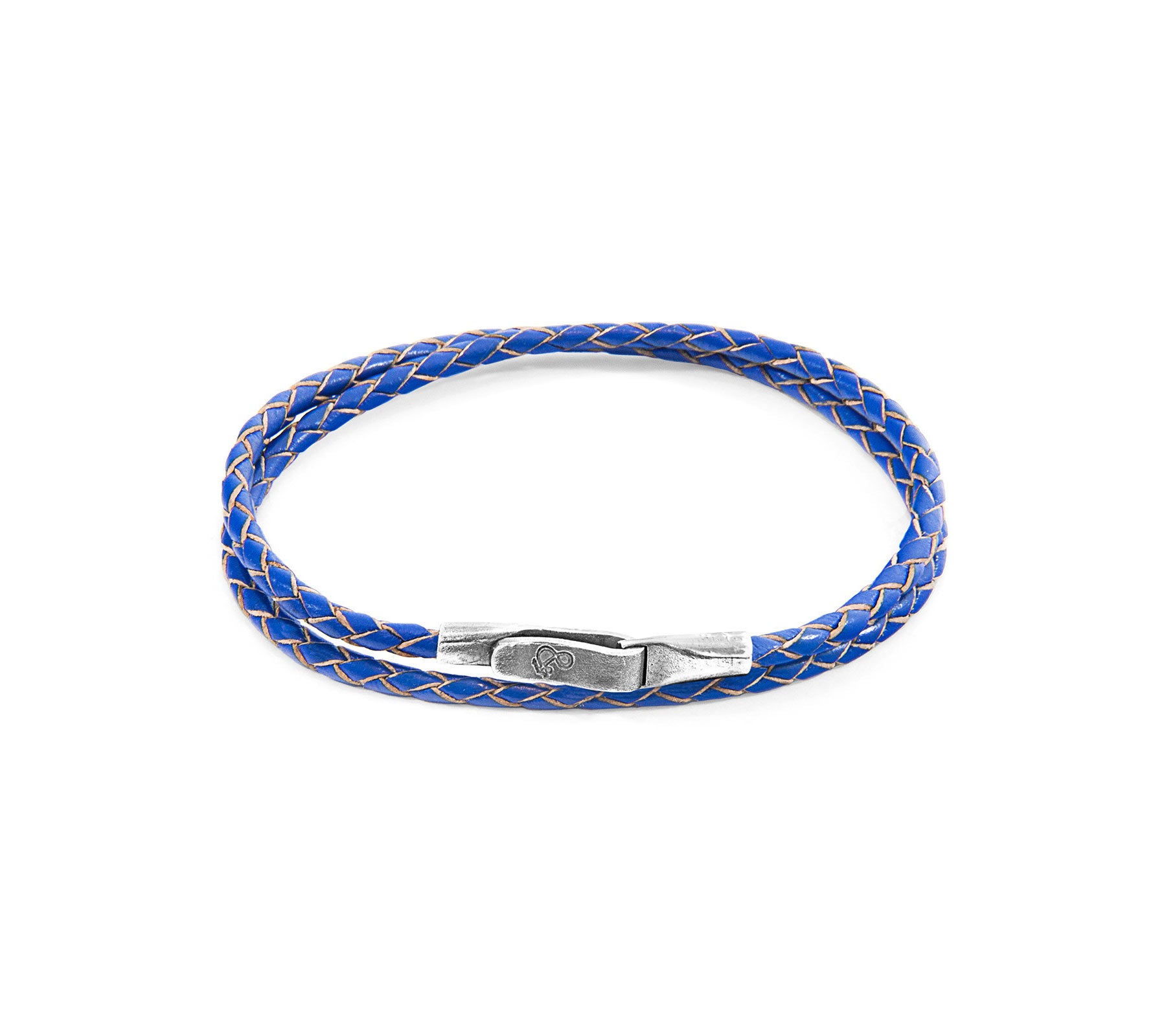 The Royal Blue Liverpool Silver and Braided Leather Bracelet was both designed and skillfully handcrafted completely in Great Britain. Combining British craft manufacturing with a discerning modern-minimalist style, this ANCHOR & CREW bracelet features: Genuine and natural round-shaped braided leather, secure solid .925 sterling silver flat clasp and hook (GB). To take the bracelet on or off your wrist, simply double wrap the bracelet, then slide the hook over the flat clasp and secure.