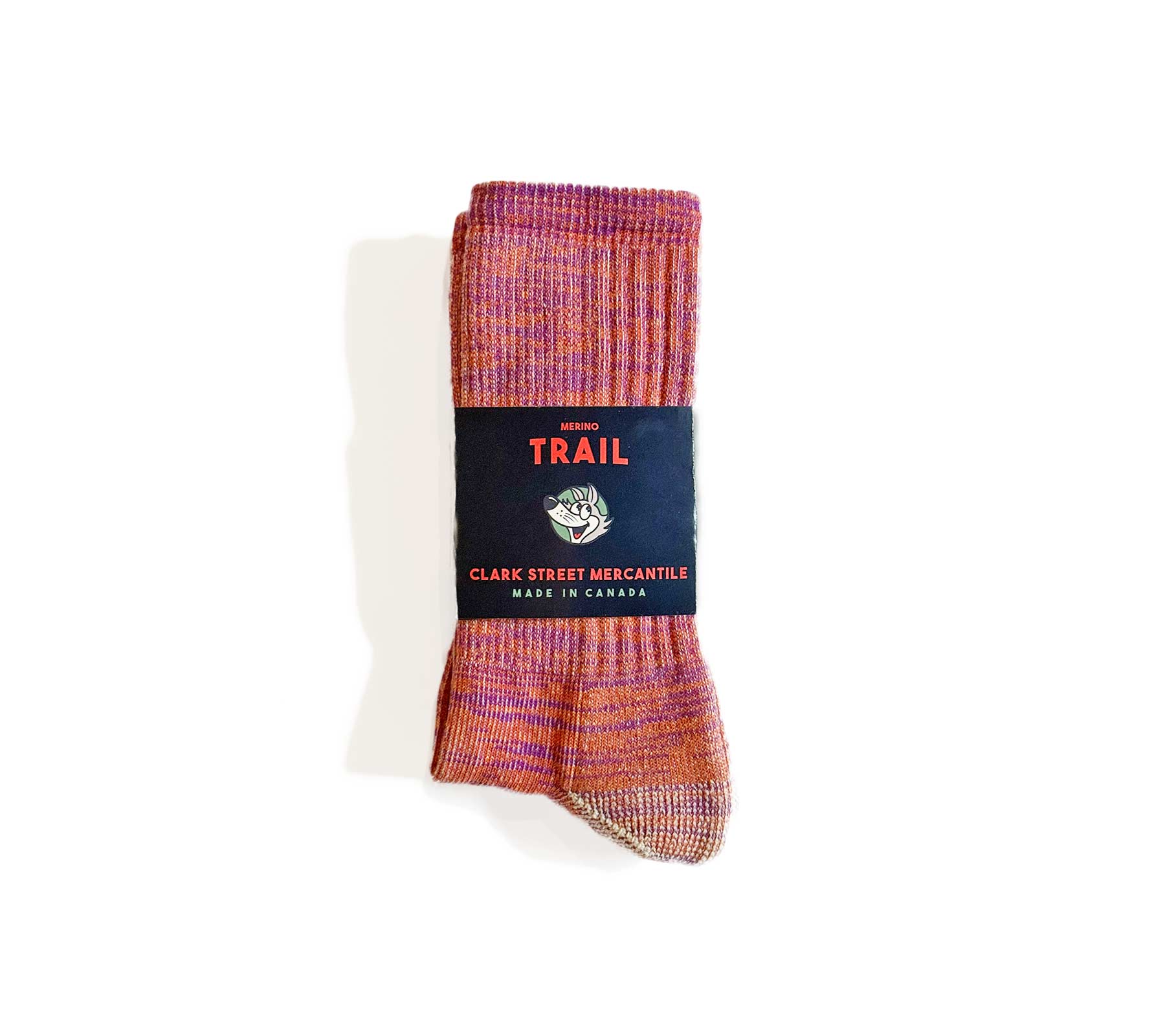 Engineered for the trail or city streets, the Merino Trail Socks deliver all-day comfort, durability, and moisture management. Knit in Canada from 74% Merino wool, they offer natural softness, temperature regulation, and moisture-wicking performance. Half-cushion padding, arch support, and reinforced heel and toe zones provide stability and durability on every step, while the double cuff and calf ribbing ensure a secure, snug fit.