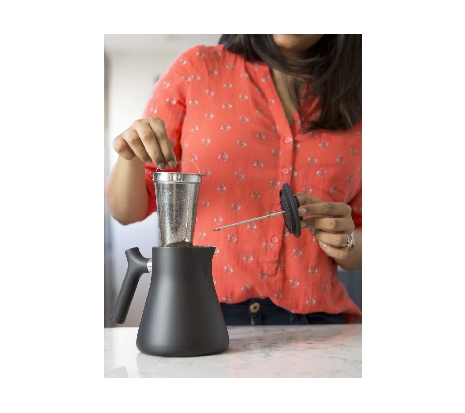 The Fellow Raven stovetop kettle and tea steeper makes steeping any type of tea easy with it's steep-range thermometer, weighted handle, and integrated tea filter. Heat and steep your tea in the same vessel, saving time and cleanup. Steep at the perfect temperature for green/white teas, oolongs and black teas using the colour guide on your steep-range thermometer. Raven’s contemporary yet classic design takes familiar shapes, like the iconic pointed tea point and mixes it with Fellow’s modern design style.