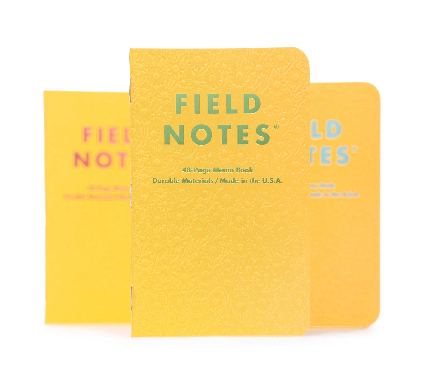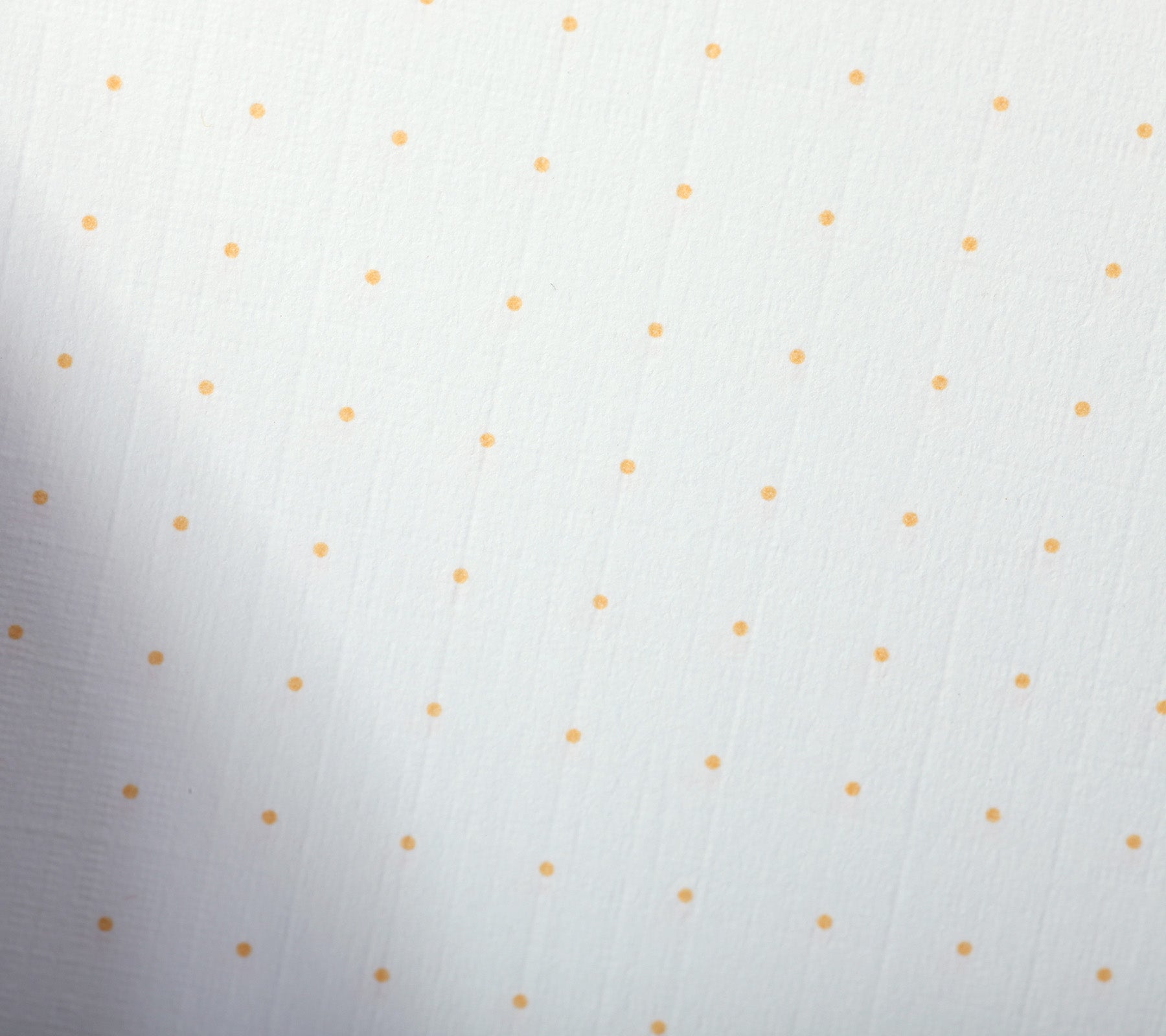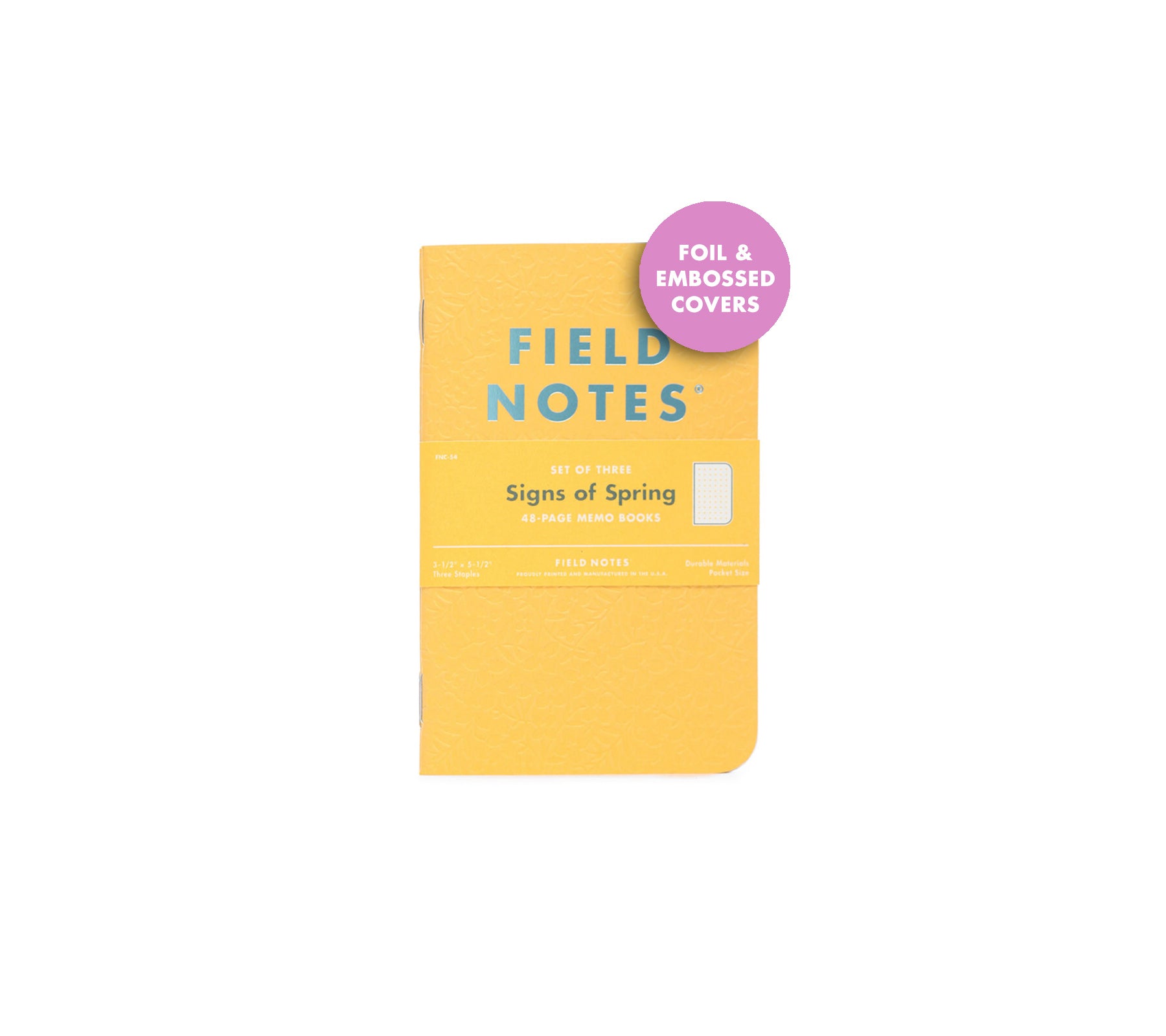 A limited edition release of 30,000 packs. It all started with a batch of Mohawk Via Vellum 80# “Yellow” stock. The covers are debossed all over, with three original graphic patterns based on flowers that appear in the North American Spring each year: the Ghost Flower (Mohavea confertiflora) in the Southwest, Quaker Ladies (Houstonia caerulea) in the East, and Contra Costa Goldfields (Lasthenia conjugens) in the San Francisco Bay area. Then the covers were hot-stamped with reflective Kurz Luxor Foils. The dot-graph insides are made from Strathmore’s Cambric 70# text, a truly superb paper. The subtle, linen-like texture gives it a ton of character and we think writers and artists are really going to love it.