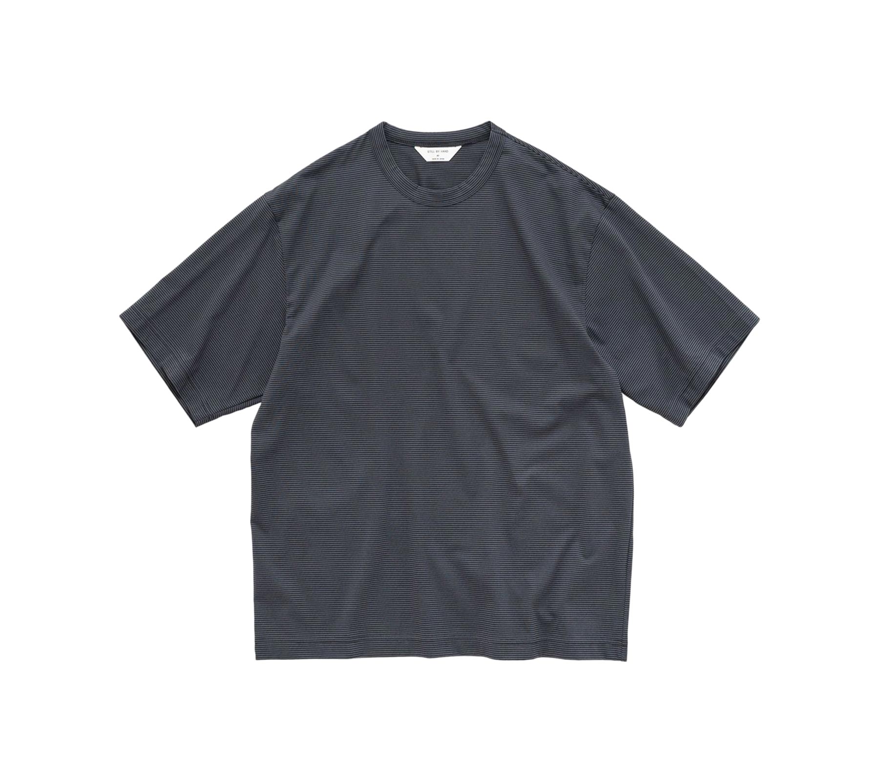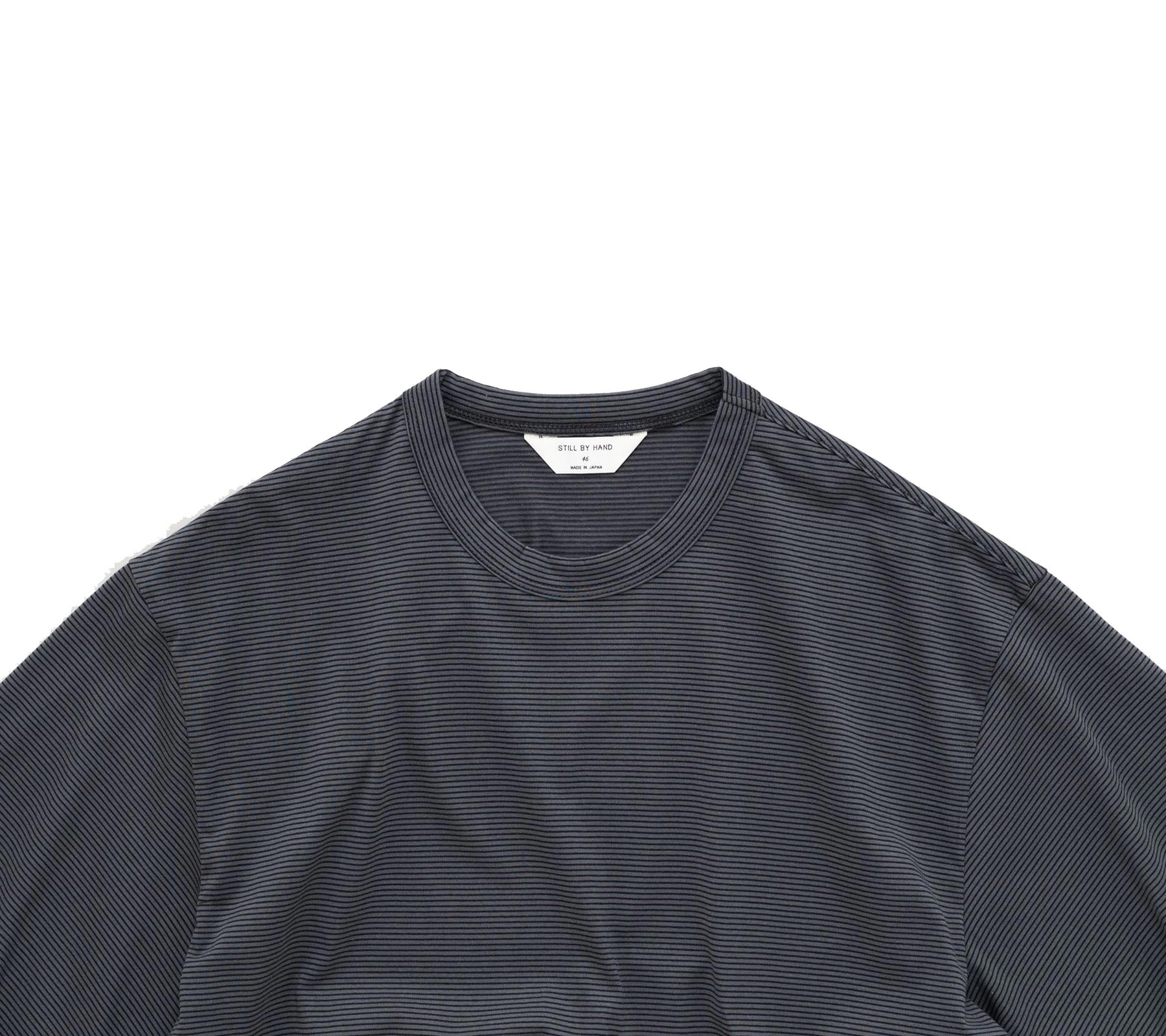 An elevated tee... Crafted from SBH's exclusive 100% plain cotton fabric of 60/2 compact yarns produced in Bishu area (across Aichi and Gifu, an area with vast experience in quality woollen fabrics). Very lightweight and can be worn by itself and layered underneath your shirt/sweater. This t-shirt has a boxy but not overly loose, regular fit, with a fairly narrow and striped neck opening, and roomy sleeves.