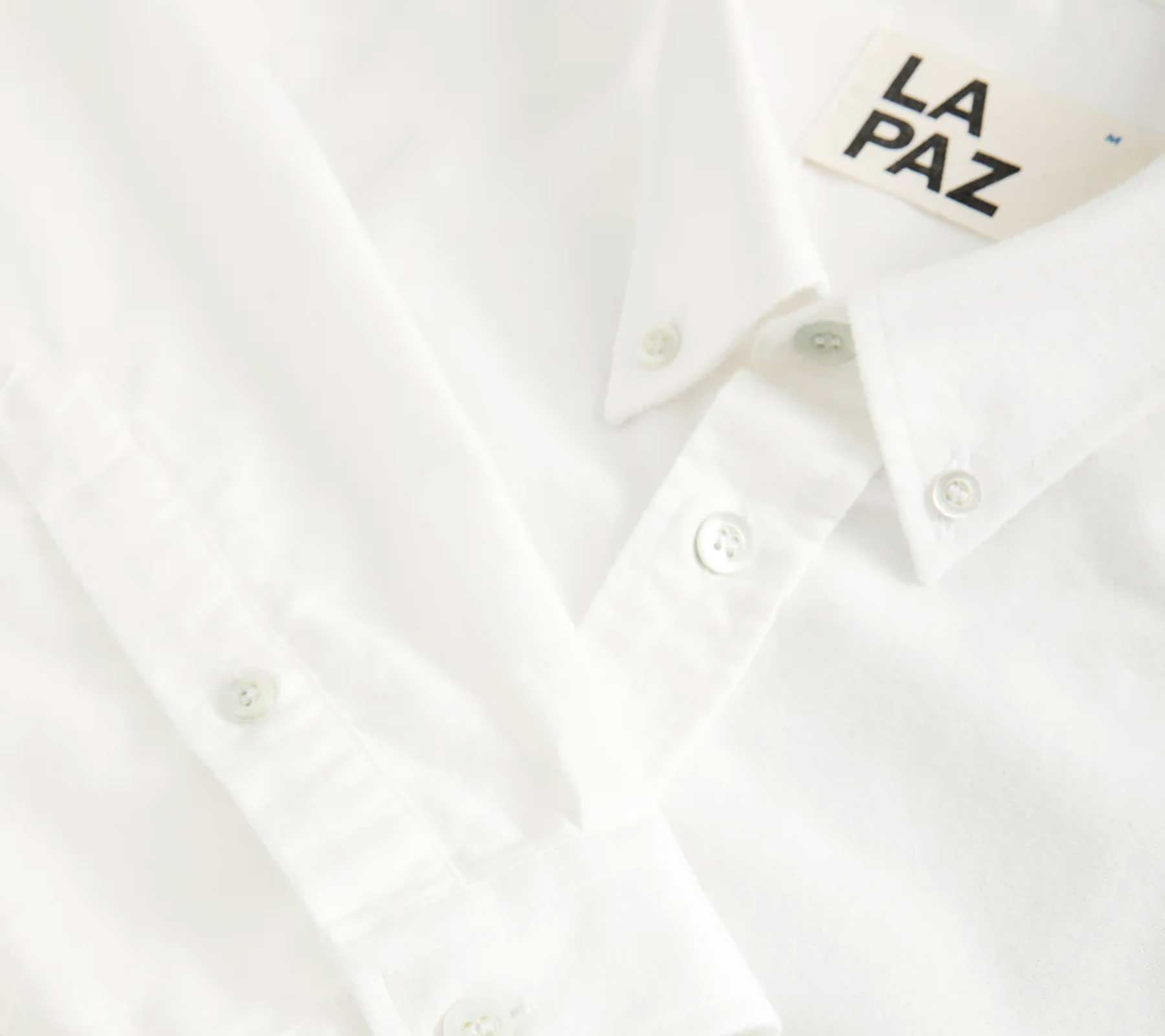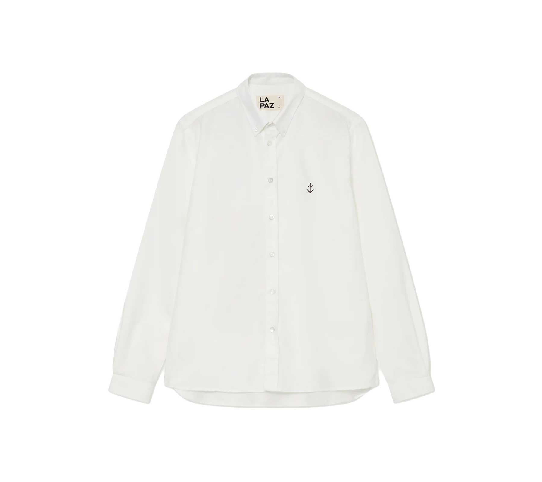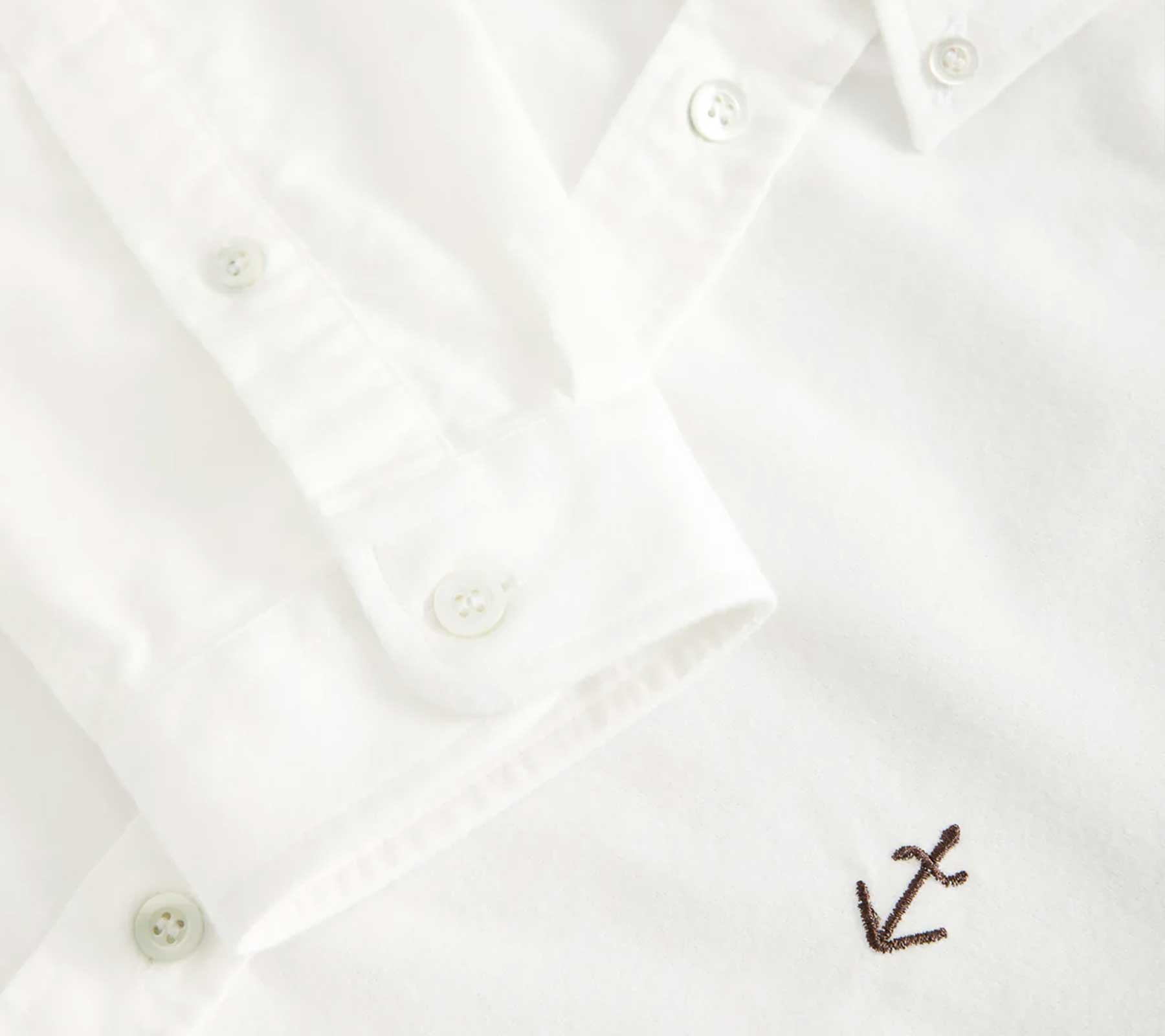 A classic cut button-down shirt with embroidered logo on chest. Made from midweight, 100% cotton in a herringbone pattern/texture. Regular Fit, True to Size, with mother of pearl buttons.