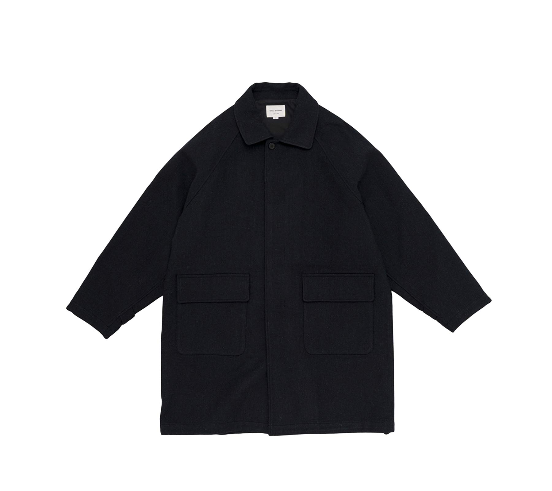 This W/N Bal Bollar Coat in Black/Navy combines expertly crafted fabric and thoughtful design details for enduring style. Made from the brand’s original 90% wool, 10% nylon tweedy fabric produced in the Bishu region, it offers a densely woven, dry, and rigid texture that feels structured on the skin while delivering a clean, classic appearance. The coat features a self-standing rigid collar and chin strap, a fly front with concealed buttons, wide armpits with roomy sleeves, and large front pockets with flaps. Additional functional touches include a sizable back yoke, adjustable buttoned sleeve straps, and a drawstring at the hem for customizable fit.